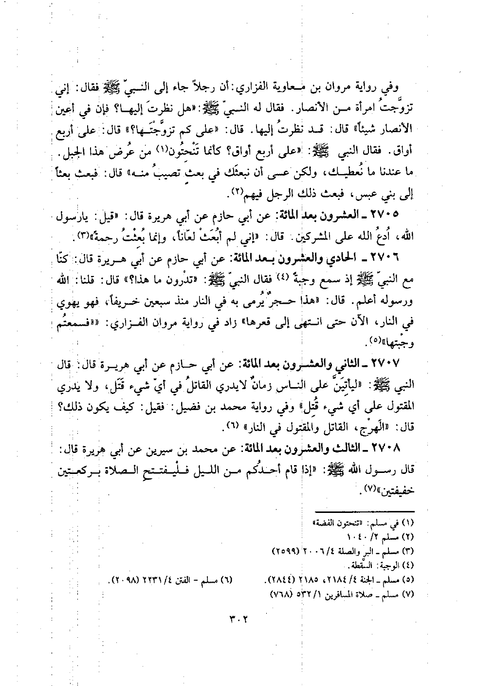 2707 - الثَّانِي وَالْعشْرُونَ بعد الْمِائَة: عَن أبي حَازِم عَن أبي هُرَيْرَة قَالَ: قَالَ النَّبِي صلى الله عَلَيْهِ وَسلم: " ليَأْتِيَن على النَّاس زمَان لَا يدْرِي الْقَاتِل فِي أَي شَيْء قتل، وَلَا يدْرِي الْمَقْتُول على أَي شَيْء قتل " وَفِي رِوَايَة مُحَمَّد بن فُضَيْل: فَقيل: كَيفَ يكون ذَلِك؟ قَالَ: " الْهَرج، الْقَاتِل والمقتول فِي النَّار ".