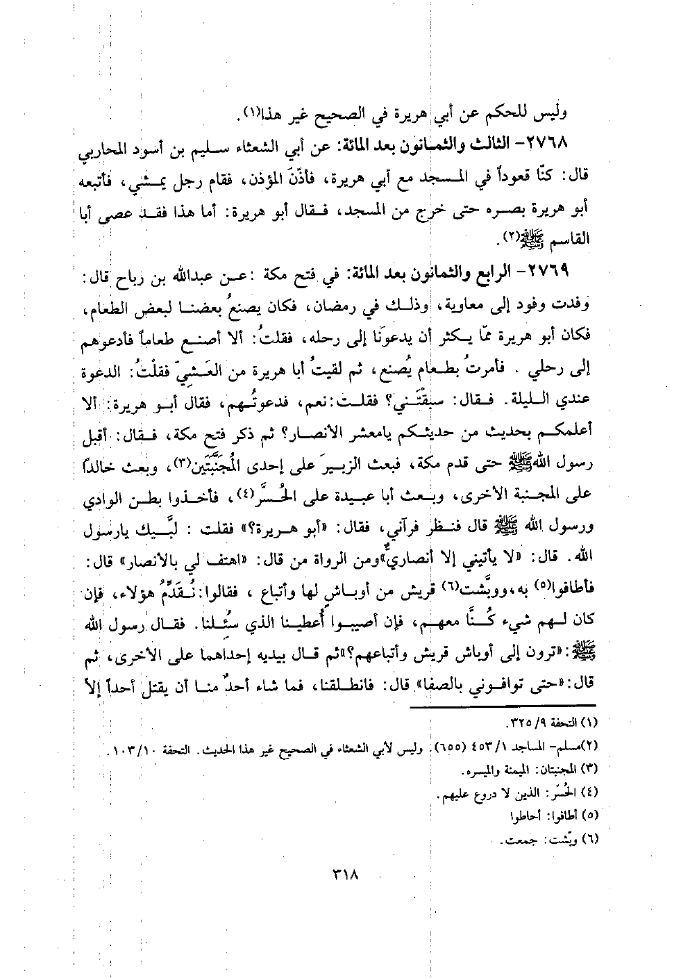 2769 - الرَّابِع وَالثَّمَانُونَ بعد الْمِائَة: فِي فتح مَكَّة: عَن عبد الله بن رَبَاح قَالَ: وفدت وُفُود إِلَى مُعَاوِيَة، وَذَلِكَ فِي رَمَضَان، فَكَانَ يصنع بَعْضنَا لبَعض الطَّعَام، فَكَانَ أَبُو هُرَيْرَة مِمَّا يكثر أَن يَدْعُونَا إِلَى رَحْله، فَقلت: أَلا أصنع طَعَاما فَأَدْعُوهُمْ إِلَى رحلي. فَأمرت بِطَعَام يصنع، ثمَّ لقِيت أَبَا هُرَيْرَة من الْعشي فَقلت: الدعْوَة عِنْدِي اللَّيْلَة. فَقَالَ: سبقتني؟ فَقلت: نعم، فدعوتهم، فَقَالَ أَبُو هُرَيْرَة: أَلا أعلمكُم بِحَدِيث من حديثكم يَا معشر الْأَنْصَار؟ ثمَّ ذكر فتح مَكَّة، فَقَالَ: أقبل رَسُول الله صلى الله عَلَيْهِ وَسلم حَتَّى قدم مَكَّة، فَبعث الزبير على إِحْدَى المجنبتين، وَبعث خَالِدا على المجنبة الْأُخْرَى، وَبعث أَبَا عُبَيْدَة على الحسر، فَأخذُوا بطن الْوَادي وَرَسُول الله صلى الله عَلَيْهِ وَسلم قَالَ فَنظر فرآني، فَقَالَ: " أَبُو هُرَيْرَة؟ " فَقلت: لبيْك يَا رَسُول الله. قَالَ: " لَا يأتيني إِلَّا أنصاريٌّ " وَمن الروَاة من قَالَ: " اهتف لي بالأنصار " قَالَ: فأطافوا بِهِ، ووبشت قُرَيْش من أوباشٍ لَهَا وَأَتْبَاع، فَقَالُوا: نقدم هَؤُلَاءِ، فَإِن كَانَ لَهُم شَيْء كُنَّا مَعَهم، فَإِن أصيبوا أعطينا الَّذِي سئلنا. فَقَالَ رَسُول الله صلى الله عَلَيْهِ وَسلم: " ترَوْنَ إِلَى أوباش قُرَيْش وأتباعهم؟ " ثمَّ قَالَ بيدَيْهِ إِحْدَاهمَا على الْأُخْرَى، ثمَّ قَالَ: " حَتَّى توافوني بالصفا " قَالَ: فَانْطَلَقْنَا، فَمَا شَاءَ أحدٌ منا أَن يقتل أحدا إِلَّا