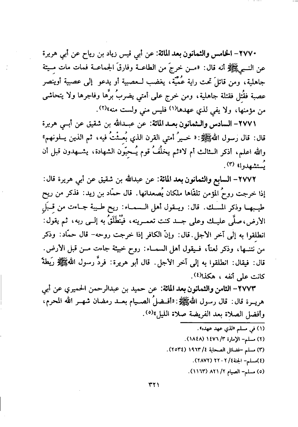 2770 - الْخَامِس وَالثَّمَانُونَ بعد الْمِائَة: عَن أبي قيس زِيَاد بن ريَاح عَن أبي هُرَيْرَة عَن النَّبِي صلى الله عَلَيْهِ وَسلم أَنه قَالَ: " من خرج من الطَّاعَة وَفَارق الْجَمَاعَة فَمَاتَ مَاتَ ميتَة جَاهِلِيَّة، وَمن قَاتل تَحت راية عمية، يغْضب لعصبية أَو يَدْعُو إِلَى عصيبة أَو ينصر عصبَة فَقتل فقتلة جَاهِلِيَّة، وَمن خرج على أمتِي يضْرب برهَا وفاجرها وَلَا يتحاشى من مؤمنها، وَلَا يَفِي لذِي عهدها فَلَيْسَ مني وَلست مِنْهُ ".