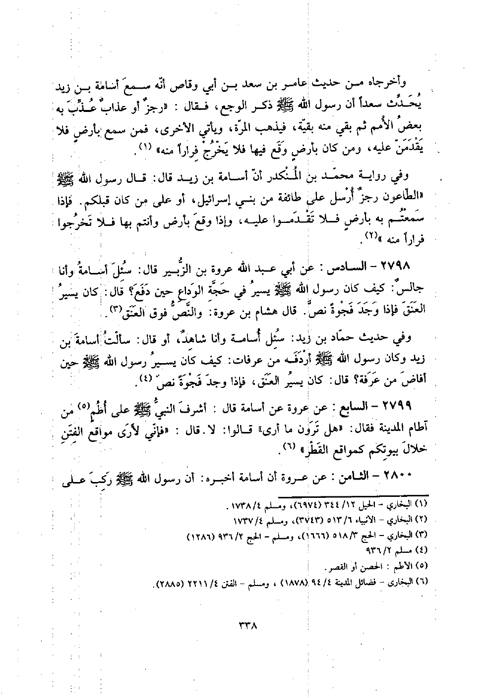 2798 - السَّادِس: عَن أبي عبد الله عُرْوَة بن الزبير قَالَ: سُئِلَ أُسَامَة وَأَنا جالسٌ: كَيفَ كَانَ رَسُول الله صلى الله عَلَيْهِ وَسلم يسير فِي حجَّة الْوَدَاع حِين دفع؟ قَالَ: كَانَ يسير الْعُنُق فَإِذا وجد فجوةً نَص. قَالَ هِشَام بن عُرْوَة: وَالنَّص فَوق الْعُنُق.