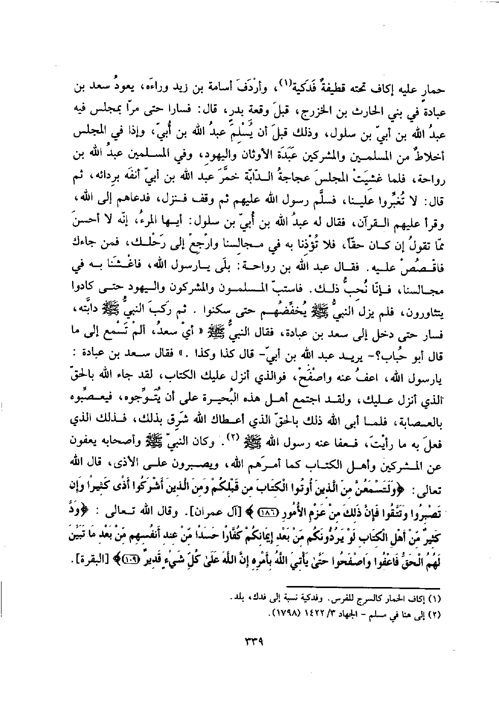 حمارٍ عَلَيْهِ إكاف تَحْتَهُ قطيفةٌ فَدَكِيَّة، وَأَرْدَفَ أُسَامَة بن زيد وَرَاءه، يعود سعد بن عبَادَة فِي بني الْحَارِث بن الْخَزْرَج، قبل وقْعَة بدرٍ، قَالَ: فسارا حَتَّى مرا بِمَجْلِس فِيهِ عبد الله بن أبي بن سلول، وَذَلِكَ قبل أَن يسلم عبد الله بن أبي، وَإِذا فِي الْمجْلس أخلاطٌ من الْمُسلمين وَالْمُشْرِكين عَبدة الْأَوْثَان وَالْيَهُود، وَفِي الْمُسلمين عبد الله بن رَوَاحَة، فَلَمَّا غشيت الْمجْلس عجاجة الدَّابَّة خمر عبد الله بن أبي أَنفه بردائه، ثمَّ قَالَ: لَا تغبروا علينا، فَسلم رَسُول الله عَلَيْهِم ثمَّ وقف فَنزل، فَدَعَاهُمْ إِلَى الله، وَقَرَأَ عَلَيْهِم الْقُرْآن، فَقَالَ لَهُ عبد الله بن أبي بن سلول: أَيهَا الْمَرْء، إِنَّه لَا أحسن مِمَّا تَقول إِن كَانَ حَقًا، فَلَا تؤذنا بِهِ فِي مجالسنا وارجع إِلَى رحلك، فَمن جَاءَك فاقصص عَلَيْهِ. فَقَالَ عبد الله بن رَوَاحَة: بلَى يَا رَسُول الله، فاغشنا بِهِ فِي مجالسنا، فَإنَّا نحب ذَلِك. فاستب الْمُسلمُونَ وَالْمُشْرِكُونَ وَالْيَهُود حَتَّى كَادُوا يتثاورون، فَلم يزل النَّبِي صلى الله عَلَيْهِ وَسلم يخفضهم حَتَّى سكنوا. ثمَّ ركب النَّبِي صلى الله عَلَيْهِ وَسلم دَابَّته، فَسَار حَتَّى دخل إِلَى سعد بن عبَادَة، فَقَالَ النَّبِي صلى الله عَلَيْهِ وَسلم " أَي سعد، ألم تسمع إِلَى مَا قَالَ أَبُو حباب؟ - يُرِيد عبد الله بن أبي - قَالَ كَذَا وَكَذَا. " فَقَالَ سعد بن عبَادَة: يَا رَسُول الله، اعْفُ عَنهُ وَاصْفَحْ، فوالذي أنزل عَلَيْك الْكتاب، لقد جَاءَ الله بِالْحَقِّ الَّذِي أنزل عَلَيْك، وَلَقَد اجْتمع أهل هَذِه الْبحيرَة على أَن يُتَوِّجُوهُ، فيعصبوه بِالْعِصَابَةِ، فَلَمَّا أَبى الله ذَلِك بِالْحَقِّ الَّذِي أَعْطَاك الله شَرق بذلك، فَذَلِك الَّذِي فعل بِهِ مَا رَأَيْت، فَعَفَا عَنهُ رَسُول الله صلى الله عَلَيْهِ وَسلم. وَكَانَ النَّبِي صلى الله عَلَيْهِ وَسلم وَأَصْحَابه يعفون عَن الْمُشْركين وَأهل الْكتاب كَمَا أَمرهم الله، ويصبرون على الْأَذَى، قَالَ الله تَعَالَى: {ولتسمعن من الَّذين أُوتُوا الْكتاب من قبلكُمْ وَمن الَّذين أشركوا أَذَى كثيرا وَإِن تصبروا وتتقوا فَإِن ذَلِك من عزم الْأُمُور} [آل عمرَان] . وَقَالَ الله تَعَالَى: {ود كثيرٌ من أهل الْكتاب لَو يردونكم من بعد إيمَانكُمْ كفَّارًا حسداً من عِنْد أنفسهم من بعد مَا تبين لَهُم الْحق فاعفوا واصفحوا حَتَّى يَأْتِي الله بأَمْره إِن الله على كل شيءٍ قدير} [الْبَقَرَة] .