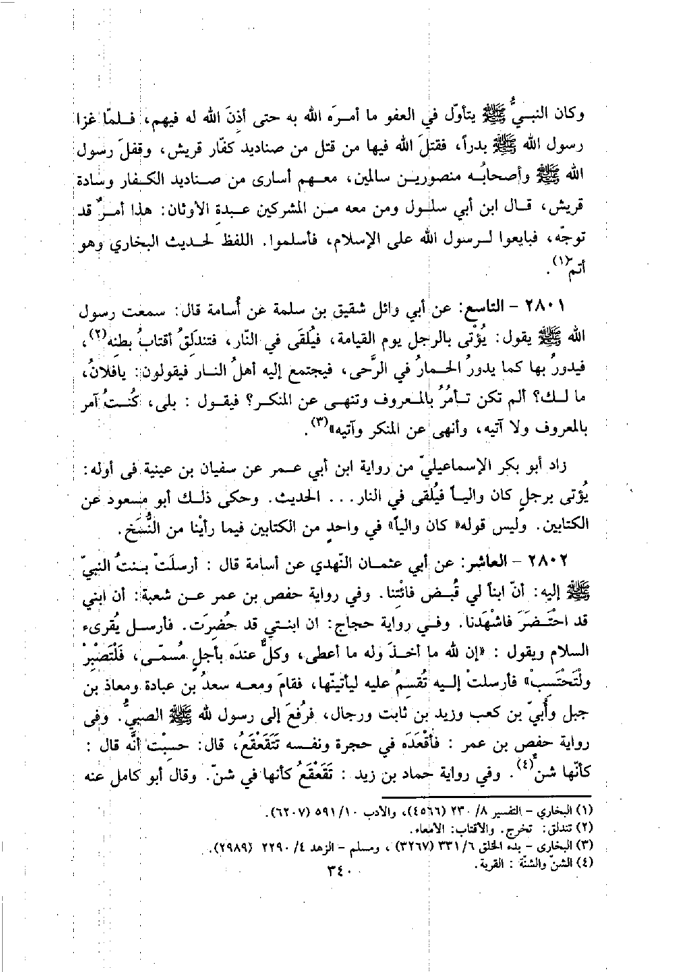 2801 - التَّاسِع: عَن أبي وَائِل شَقِيق بن سَلمَة عَن أُسَامَة قَالَ: سَمِعت رَسُول الله صلى الله عَلَيْهِ وَسلم يَقُول: يُؤْتى بِالرجلِ يَوْم الْقِيَامَة، فَيلقى فِي النَّار، فتندلق أقتاب بَطْنه، فيدور بهَا كَمَا يَدُور الْحمار فِي الرَّحَى، فيجتمع إِلَيْهِ أهل النَّار فَيَقُولُونَ: يَا فلَان، مَا لَك؟ الم ألم تكن تَأمر بِالْمَعْرُوفِ وتنهى عَن الْمُنكر؟ فَيَقُول: بلَى، كنت آمُر بِالْمَعْرُوفِ وَلَا آتيه، وأنهى عَن الْمُنكر وآتيه ".