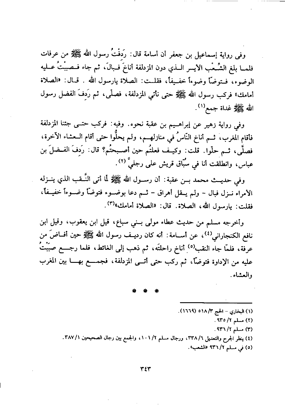 وَفِي رِوَايَة زُهَيْر عَن إِبْرَاهِيم بن عقبَة نَحوه. وَفِيه: فَركب حَتَّى جِئْنَا الْمزْدَلِفَة فَأَقَامَ الْمغرب، ثمَّ أَنَاخَ النَّاس فِي مَنَازِلهمْ، وَلم يحلوا حَتَّى أَقَامَ الْعشَاء الْآخِرَة، فصلى، ثمَّ حلوا. قلت: وَكَيف فَعلْتُمْ حِين أَصْبَحْتُم؟ قَالَ: ردف الْفضل بن عَبَّاس، وَانْطَلَقت أَنا فِي سباق قُرَيْش على رجْلي.