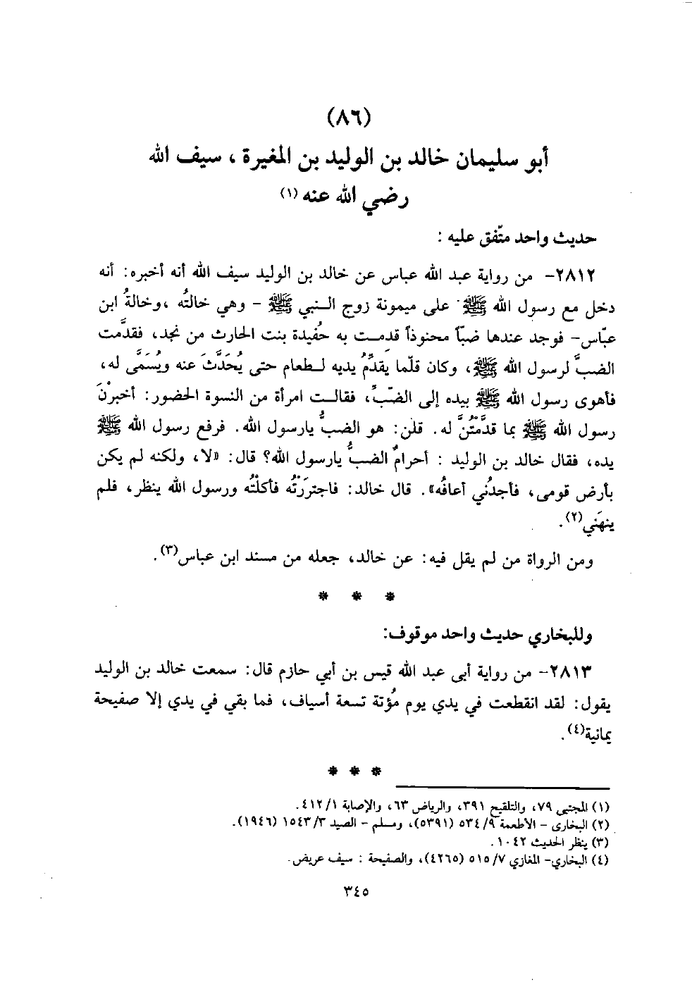 2812 - من رِوَايَة عبد الله عَبَّاس عَن خَالِد بن الْوَلِيد سيف الله أَنه أخبرهُ: أَنه دخل مَعَ رَسُول الله صلى الله عَلَيْهِ وَسلم على مَيْمُونَة زوج النَّبِي صلى الله عَلَيْهِ وَسلم - وَهِي خَالَته، وَخَالَة ابْن عَبَّاس - فَوجدَ عِنْدهَا ضباً محنوذاً قدمت بِهِ حفيدة بنت الْحَارِث من نجد، فَقدمت الضَّب لرَسُول الله صلى الله عَلَيْهِ وَسلم، وَكَانَ قَلما يقدم يَدَيْهِ لطعام حَتَّى يحدث عَنهُ وَيُسمى لَهُ، فَأَهوى رَسُول الله صلى الله عَلَيْهِ وَسلم بِيَدِهِ إِلَى الضَّب، فَقَالَت امْرَأَة من النسْوَة الْحُضُور: أخبرن رَسُول الله صلى الله عَلَيْهِ وَسلم بِمَا قدمتن لَهُ. قُلْنَ: هُوَ الضَّب يَا رَسُول الله صلى الله عَلَيْهِ وَسلم. فَرفع رَسُول الله صلى الله عَلَيْهِ وَسلم يَده، فَقَالَ خَالِد بن الْوَلِيد: أحرامٌ الضَّب يَا رَسُول الله؟ قَالَ: " لَا، وَلكنه لم يكن بِأَرْض قومى، فأجدني أعافه ". قَالَ خَالِد: فاجتررته فأكلته وَرَسُول الله ينظر، فَلم ينهني.