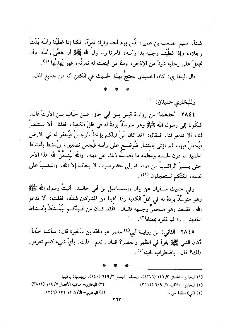 2844 - أَحدهمَا: من رِوَايَة قيس بن أبي حَازِم عَن خباب بن الْأَرَت قَالَ: شَكَوْنَا إِلَى رَسُول الله صلى الله عَلَيْهِ وَسلم وَهُوَ متوسدٌ بردة لَهُ فِي ظلّ الْكَعْبَة، فَقُلْنَا: أَلا تَسْتَنْصِر لنا، أَلا تَدْعُو لنا. فَقَالَ: " قد كَانَ من قبلكُمْ يُؤْخَذ الرجل فيحفر لَهُ فِي الأَرْض فَيجْعَل فِيهَا، ثمَّ يُؤْتى بالمئشار فَيُوضَع على رَأسه فَيجْعَل نِصْفَيْنِ، وَيُمشط بِأَمْشَاط الْحَدِيد مَا دون لَحْمه وعظمه مَا يصده ذَلِك عَن دينه. وَالله لَيتِمَّن الله هَذَا الْأَمر حَتَّى يسير الرَّاكِب من صنعاء إِلَى حضر موت لَا يخَاف إِلَّا الله، وَالذِّئْب على غنمه، لكنكم تَسْتَعْجِلُون ".