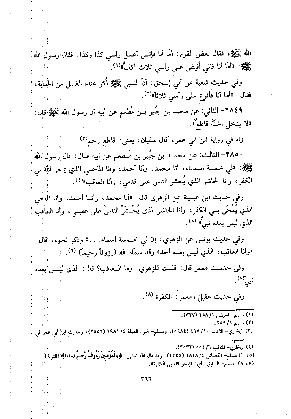 2850 - الثَّالِث: عَن مُحَمَّد بن جُبَير بن مطعم عَن أَبِيه قَالَ: قَالَ رَسُول الله صلى الله عَلَيْهِ وَسلم: " لي خَمْسَة أَسمَاء، أَنا مُحَمَّد، وَأَنا أَحْمد، وَأَنا الماحي الَّذِي يمحو الله بِي الْكفْر، وَأَنا الحاشر الَّذِي يحْشر النَّاس على قدمي، وَأَنا العاقب ".
