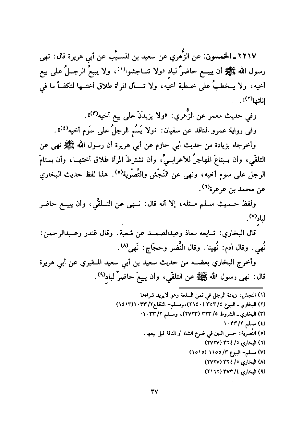 أَن رَسُول الله صلى الله عَلَيْهِ وَسلم نهى عَن التلقي، وَأَن يبْتَاع المُهَاجر للأعرابي، وَأَن تشْتَرط الْمَرْأَة طَلَاق أُخْتهَا، وَأَن يستام الرجل على سوم أَخِيه، وَنهى عَن النجش والتصرية. هَذَا لفظ حَدِيث البُخَارِيّ عَن مُحَمَّد بن عرْعرة.