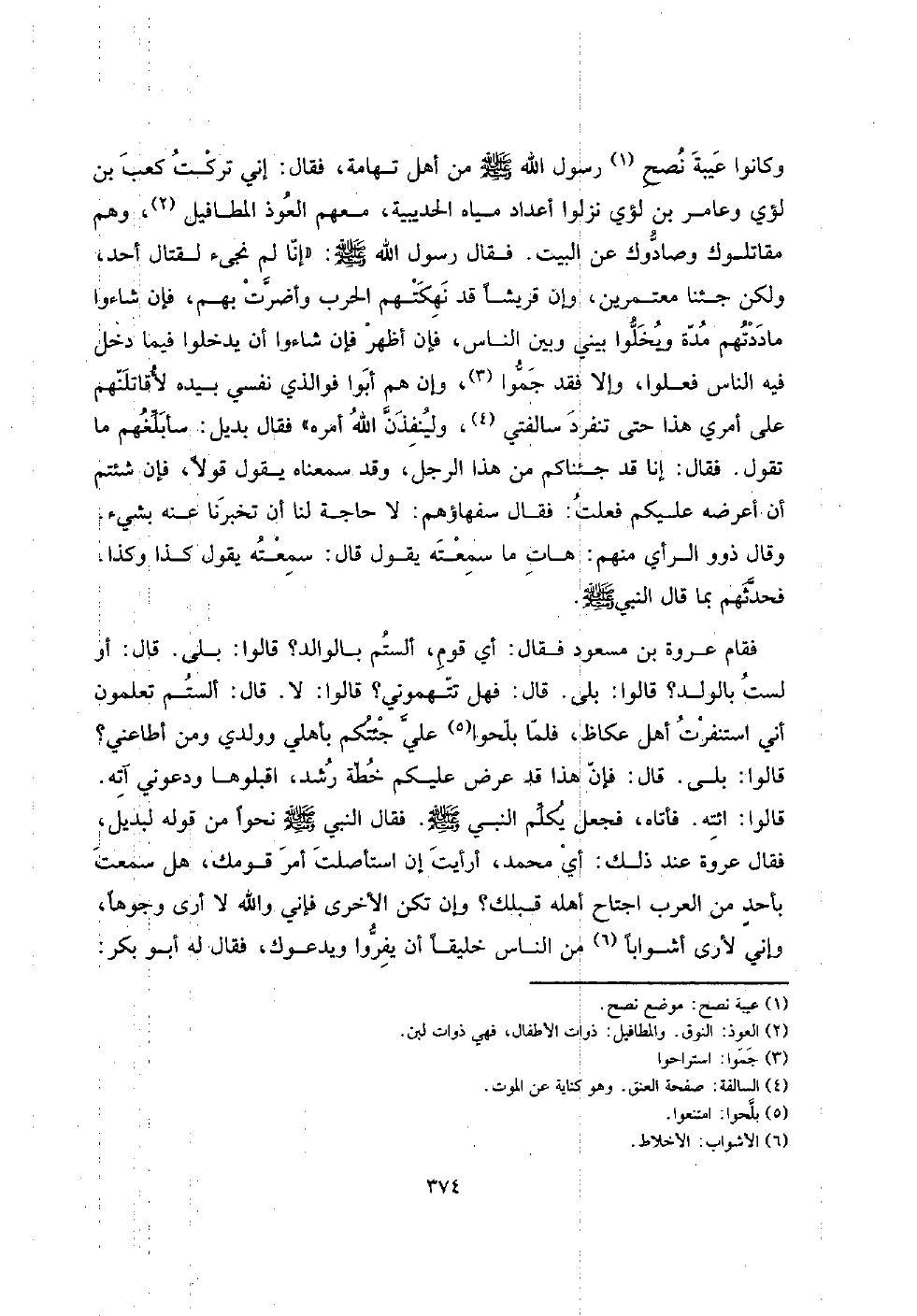قَالُوا: ائته. فَأَتَاهُ، فَجعل يكلم النَّبِي صلى الله عَلَيْهِ وَسلم. فَقَالَ النَّبِي صلى الله عَلَيْهِ وَسلم نَحوا من قَوْله لبديل، فَقَالَ عُرْوَة عِنْد ذَلِك: أَي مُحَمَّد، أَرَأَيْت إِن استأصلت أَمر قَوْمك، هَل سَمِعت بأحدٍ من الْعَرَب اجتاح أَهله قبلك؟ وَإِن تكن الْأُخْرَى فَإِنِّي وَالله لَا أرى وُجُوهًا، وَإِنِّي لأرى أشواباً من النَّاس خليفاً أَن يَفروا ويدعوك، فَقَالَ لَهُ أَبُو بكر: