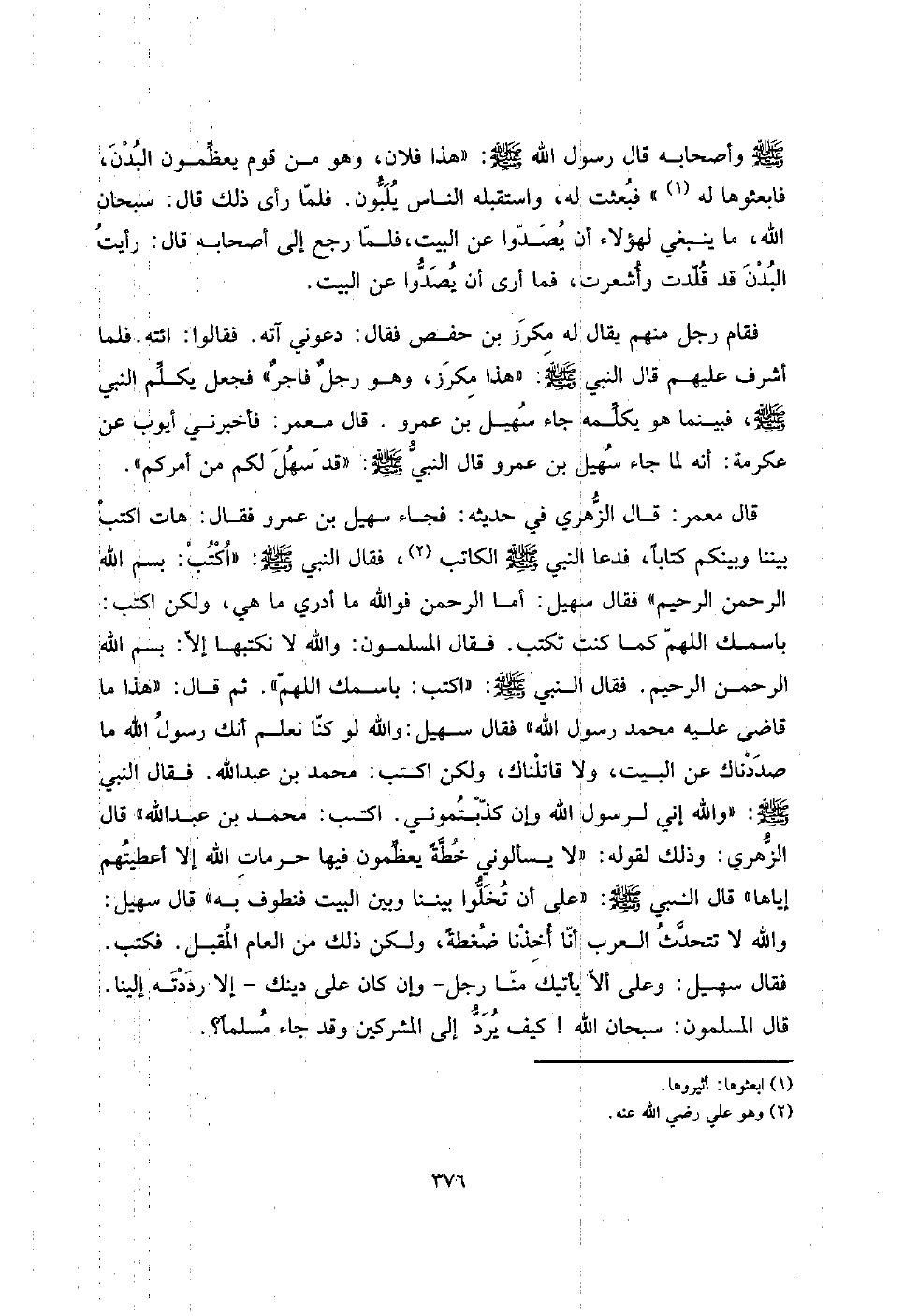 فجَاء سُهَيْل بن عَمْرو فَقَالَ: هَات اكْتُبْ بَيْننَا وَبَيْنكُم كتابا، فَدَعَا النَّبِي صلى الله عَلَيْهِ وَسلم الْكَاتِب، فَقَالَ النَّبِي صلى الله عَلَيْهِ وَسلم: " اكْتُبْ: بِسم الله الرَّحْمَن الرَّحِيم " فَقَالَ سُهَيْل: أما الرَّحْمَن فوَاللَّه مَا أَدْرِي مَا هِيَ، وَلَكِن اكْتُبْ: بِاسْمِك اللَّهُمَّ كَمَا كنت تكْتب. فَقَالَ الْمُسلمُونَ: وَالله لَا نكتبها إِلَّا: بِسم الله الرَّحْمَن الرَّحِيم. فَقَالَ النَّبِي صلى الله عَلَيْهِ وَسلم: " اكْتُبْ: بِاسْمِك اللَّهُمَّ ". ثمَّ قَالَ: " هَذَا مَا قاضى عَلَيْهِ مُحَمَّد رَسُول الله " فَقَالَ سُهَيْل: وَالله لَو كُنَّا نعلم أَنَّك رَسُول الله مَا صَدَدْنَاك عَن الْبَيْت، وَلَا قَاتَلْنَاك، وَلَكِن اكْتُبْ: مُحَمَّد بن عبد الله. فَقَالَ النَّبِي صلى الله عَلَيْهِ وَسلم: " وَالله إِنِّي لرَسُول الله وَإِن كذبتموني. اكْتُبْ: مُحَمَّد بن عبد الله " قَالَ الزُّهْرِيّ: وَذَلِكَ لقَوْله: " لَا يَسْأَلُونِي خطةً يعظمون فِيهَا حرمات الله إِلَّا أَعطيتهم إِيَّاهَا " قَالَ النَّبِي صلى الله عَلَيْهِ وَسلم: " على أَن تخلوا بَيْننَا وَبَين الْبَيْت فنطوف بِهِ " قَالَ سُهَيْل: وَالله لَا تَتَحَدَّث الْعَرَب أَنا أَخذنَا ضغطةً، وَلَكِن ذَلِك من الْعَام الْمقبل. فَكتب. فَقَالَ سُهَيْل: وعَلى أَلا يَأْتِيك منا رجل - وَإِن كَانَ على دينك - إِلَّا رَددته إِلَيْنَا.