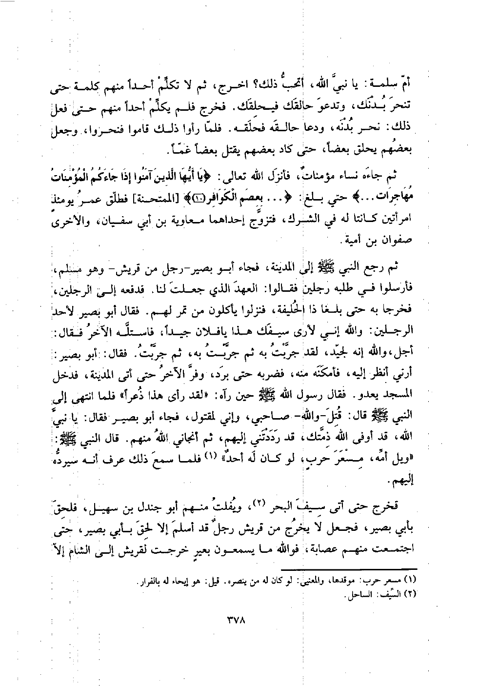 ثمَّ رَجَعَ النَّبِي صلى الله عَلَيْهِ وَسلم إِلَى الْمَدِينَة، فجَاء أَبُو بَصِير - رجل من قُرَيْش - وَهُوَ مُسلم، فأرسلوا فِي طلبه رجلَيْنِ فَقَالُوا: الْعَهْد الَّذِي جعلت لنا. فَدفعهُ إِلَى الرجلَيْن، فَخَرَجَا بِهِ حَتَّى بلغا ذَا الحليفة، فنزلوا يَأْكُلُون من تمر لَهُم. فَقَالَ أَبُو بَصِير لأحد الرجلَيْن: وَالله إِنِّي لأرى سَيْفك هَذَا يَا فلَان جيدا، فاستله الآخر فَقَالَ: أجل، وَالله إِنَّه لجيد، لقد جربت بِهِ ثمَّ جربت بِهِ، ثمَّ جربت. فَقَالَ: أَبُو بَصِير: أَرِنِي أنظر إِلَيْهِ، فأمكنه مِنْهُ، فَضَربهُ حَتَّى برد، وفر الآخر حَتَّى أَتَى الْمَدِينَة، فَدخل الْمَسْجِد يعدو. فَقَالَ رَسُول الله صلى الله عَلَيْهِ وَسلم حِين رَآهُ: " لقد رأى هَذَا ذعراً " فَلَمَّا انْتهى إِلَى النَّبِي صلى الله عَلَيْهِ وَسلم قَالَ: قتل - وَالله - صَاحِبي، وَإِنِّي لمقتول، فجَاء أَبُو بَصِير فَقَالَ: يَا نَبِي الله، قد أوفى الله ذِمَّتك، قد رددتني إِلَيْهِم، ثمَّ أنجاني الله مِنْهُم. قَالَ النَّبِي صلى الله عَلَيْهِ وَسلم: " ويل أمه، مسعر حربٍ، لَو كَانَ لَهُ أحدٌ " فَلَمَّا سمع ذَلِك عرف أَنه سيرده إِلَيْهِم.