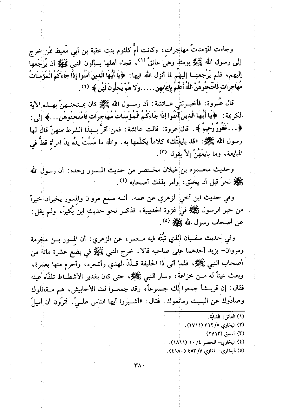 وَجَاءَت الْمُؤْمِنَات مهاجرات، وَكَانَت أم كُلْثُوم بنت عقبَة بن أبي معيط مِمَّن خرج إِلَى رَسُول الله صلى الله عَلَيْهِ وَسلم يومئذٍ وَهِي عاتقٌ، فجَاء أَهلهَا يسْأَلُون النَّبِي صلى الله عَلَيْهِ وَسلم أَن يرجعها إِلَيْهِم، فَلم يرجعها إِلَيْهِم لما أنزل الله فِيهَا: {يَا أَيهَا الَّذين آمنُوا إِذا جَاءَكُم الْمُؤْمِنَات مهاجرات فامتحنوهن الله أعلم بإيمانهن ... . . وَلَا هم يحلونَ لَهُنَّ} .