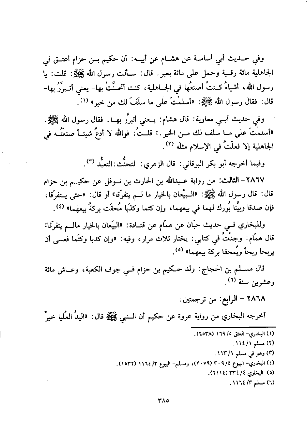 وَفِي حَدِيث أبي أُسَامَة عَن هِشَام عَن أَبِيه: أَن حَكِيم بن حزَام أعتق فِي الْجَاهِلِيَّة مائَة رَقَبَة وَحمل على مائَة بعير. قَالَ: سَأَلت رَسُول الله صلى الله عَلَيْهِ وَسلم: قلت: يَا رَسُول الله، أَشْيَاء كنت أصنعها فِي الْجَاهِلِيَّة، كنت أتحنث بهَا - يَعْنِي أتبرر بهَا - قَالَ: فَقَالَ رَسُول الله صلى الله عَلَيْهِ وَسلم: " أسلمت على مَا سلف لَك من خير ".