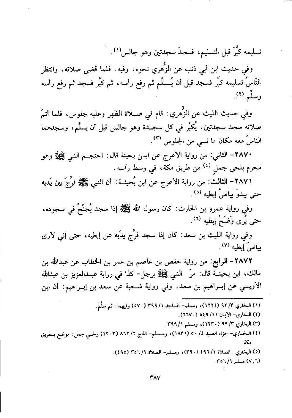 2871 - الثَّالِث: من رِوَايَة الْأَعْرَج عَن ابْن بُحَيْنَة: أَن النَّبِي صلى الله عَلَيْهِ وَسلم فرج بَين يَدَيْهِ حَتَّى يَبْدُو بَيَاض إبطَيْهِ.