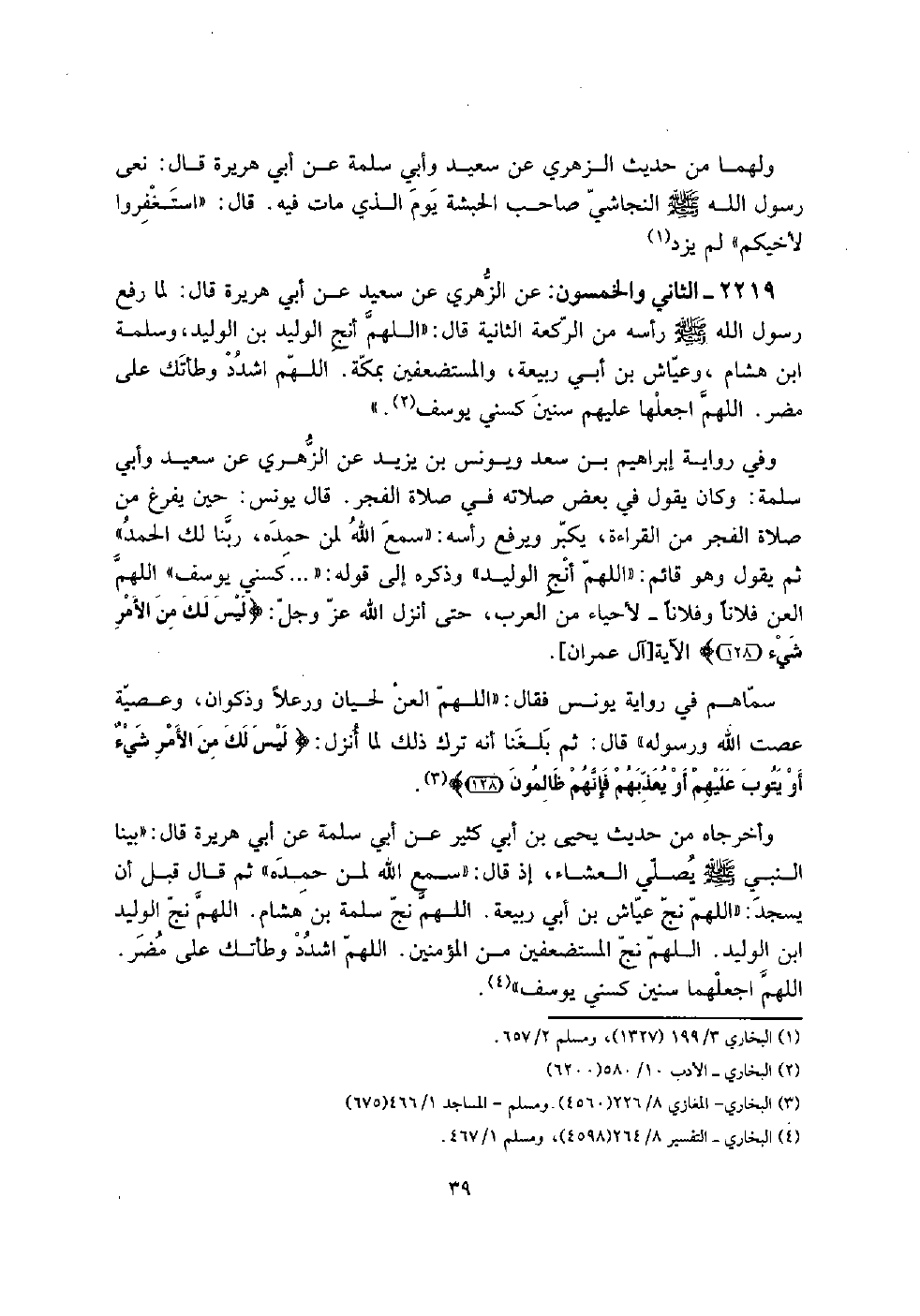 2219 - الثَّانِي وَالْخَمْسُونَ: عَن الزُّهْرِيّ عَن سعيد عَن أبي هُرَيْرَة قَالَ: لما رفع رَسُول الله صلى الله عَلَيْهِ وَسلم رَأسه من الرَّكْعَة الثَّانِيَة قَالَ: " اللَّهُمَّ أَنْج الْوَلِيد بن الْوَلِيد، وَسَلَمَة ابْن هِشَام، وَعَيَّاش بن أبي ربيعَة، وَالْمُسْتَضْعَفِينَ بِمَكَّة. اللَّهُمَّ اشْدُد وطأتك على مُضر. اللَّهُمَّ اجْعَلْهَا عَلَيْهِم سِنِين كَسِنِي يُوسُف. "