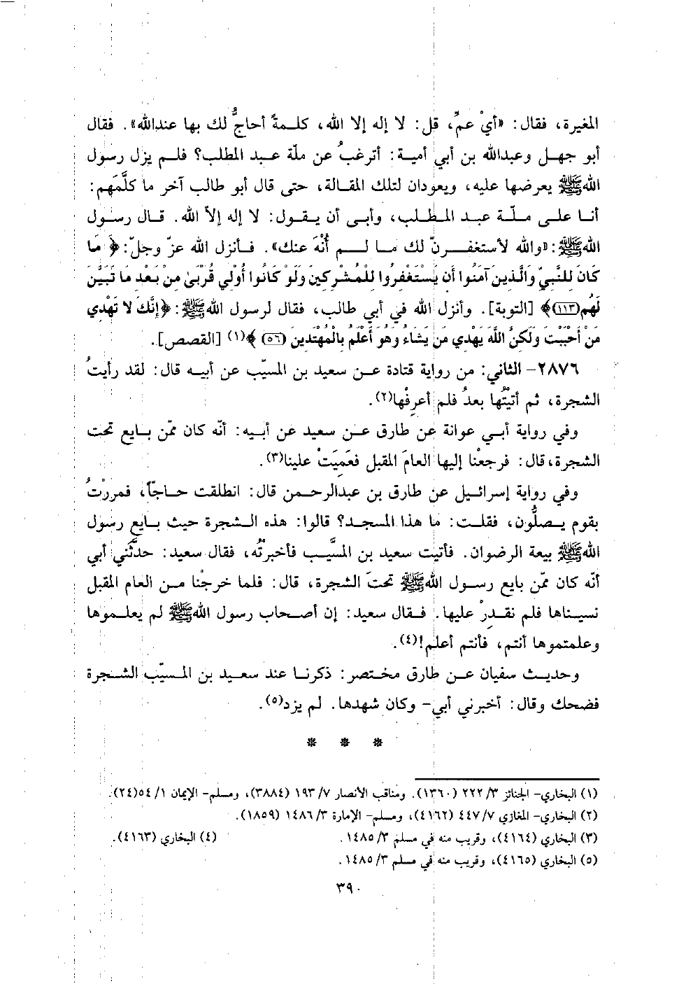 أترغب عَن مِلَّة عبد الْمطلب؟ فَلم يزل رَسُول الله صلى الله عَلَيْهِ وَسلم يعرضهَا عَلَيْهِ، ويعودان لتِلْك الْمقَالة، حَتَّى قَالَ أَبُو طَالب آخر مَا كَلمهمْ: أَنا على مِلَّة عبد الْمطلب، وأبى أَن يَقُول: لَا إِلَه إِلَّا الله. قَالَ رَسُول