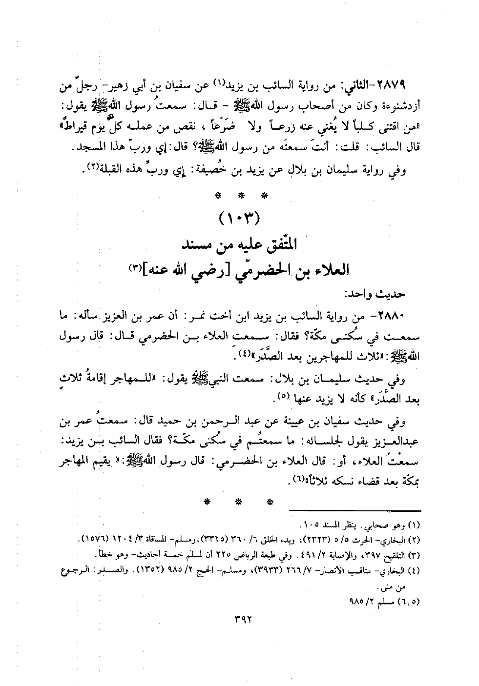 2880 - من رِوَايَة السَّائِب بن يزِيد ابْن أُخْت نمر: أَن عمر بن الْعَزِيز سَأَلَهُ: مَا سَمِعت فِي سُكْنى مَكَّة؟ فَقَالَ: سَمِعت الْعَلَاء بن الْحَضْرَمِيّ قَالَ: قَالَ رَسُول الله صلى الله عَلَيْهِ وَسلم: " ثَلَاث للمهاجرين بعد الصَّدْر ".