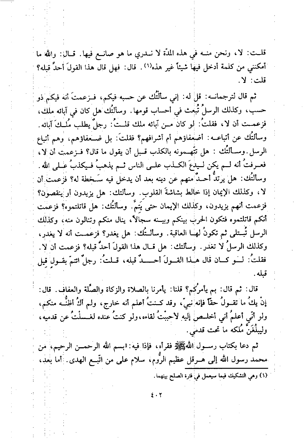 ثمَّ دَعَا بِكِتَاب رَسُول الله صلى الله عَلَيْهِ وَسلم فقرأه، فَإِذا فِيهِ: " بِسم الله الرَّحْمَن الرَّحِيم، من مُحَمَّد رَسُول الله إِلَى هِرقل عَظِيم الرّوم، سَلام على من اتبع الْهدى. أما بعد،