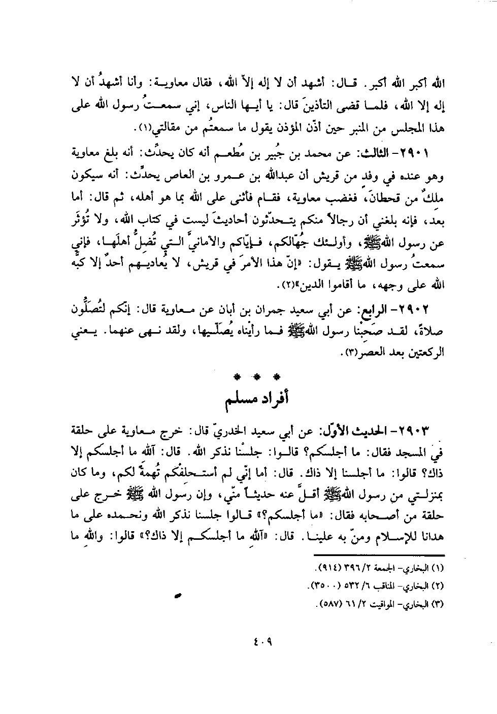 2901 - الثَّالِث: عَن مُحَمَّد بن جُبَير بن مطعم أَنه كَانَ يحدث: أَنه بلغ مُعَاوِيَة وَهُوَ عِنْده فِي وفدٍ من قُرَيْش أَن عبد الله بن عَمْرو بن الْعَاصِ يحدث: أَنه سَيكون ملكٌ من قحطان، فَغَضب مُعَاوِيَة، فَقَامَ فَأثْنى على الله بِمَا هُوَ أَهله، ثمَّ قَالَ: أما بعد، فَإِنَّهُ بَلغنِي أَن رجَالًا مِنْكُم يتحدثون أَحَادِيث لَيست فِي كتاب الله، وَلَا تُؤثر عَن رَسُول الله صلى الله عَلَيْهِ وَسلم، وَأُولَئِكَ جهالكم، فإياكم والأماني الَّتِي تضل أَهلهَا، فَإِنِّي سَمِعت رَسُول الله صلى الله عَلَيْهِ وَسلم يَقُول: " إِن هَذَا الْأَمر فِي قُرَيْش، لَا يعاديهم أحدٌ إِلَّا كَبه الله على وَجهه، مَا أَقَامُوا الدّين ".
