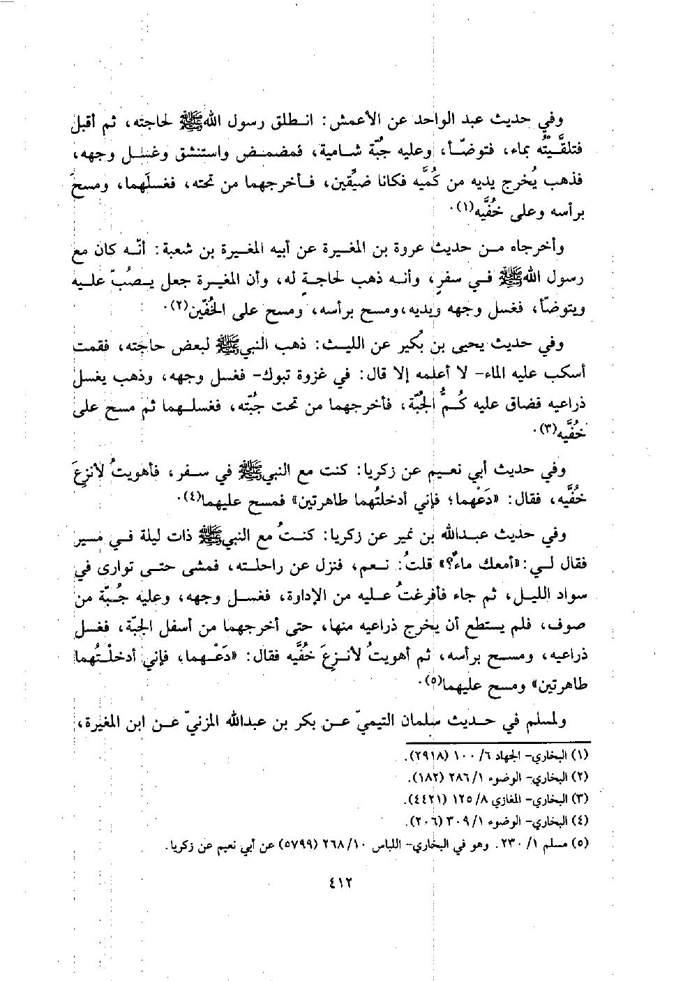 كنت مَعَ النَّبِي صلى الله عَلَيْهِ وَسلم ذَات لَيْلَة فِي مسير فَقَالَ لي: " أَمَعَك ماءٌ؟ " قلت: نعم، فَنزل عَن رَاحِلَته، فَمشى حَتَّى توارى فِي سَواد اللَّيْل، ثمَّ جَاءَ فأفرغت عَلَيْهِ من الْإِدَاوَة، فَغسل وَجهه، وَعَلِيهِ جُبَّة من صوف، فَلم يسْتَطع أَن يخرج ذِرَاعَيْهِ مِنْهَا، حَتَّى أخرجهُمَا من أَسْفَل الْجُبَّة، فَغسل ذِرَاعَيْهِ، وَمسح بِرَأْسِهِ، ثمَّ أهويت لأنزع خفيه فَقَالَ: " دعهما، فَإِنِّي أدخلتهما طاهرتين " وَمسح عَلَيْهِمَا.