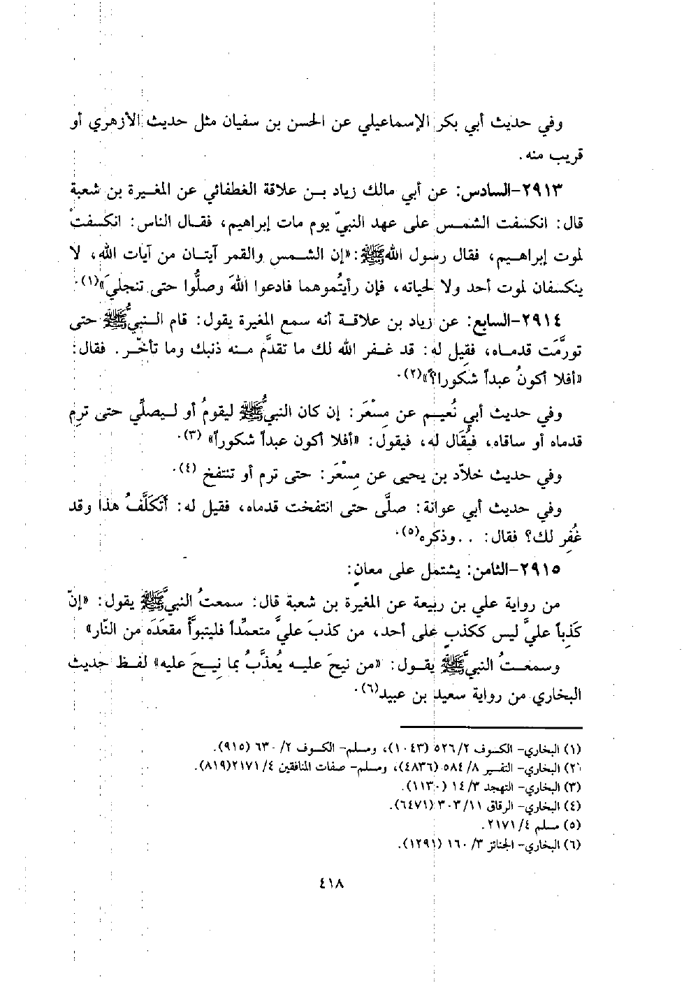 2914 - السَّابِع: عَن زِيَاد بن علاقَة أَنه سمع الْمُغيرَة يَقُول: قَامَ النَّبِي صلى الله عَلَيْهِ وَسلم حَتَّى تورمت قدماه، فَقيل لَهُ: قد غفر الله لَك مَا تقدم مِنْهُ ذَنْبك وَمَا تَأَخّر. فَقَالَ: " أَفلا أكون عبدا شكُورًا؟ ".
