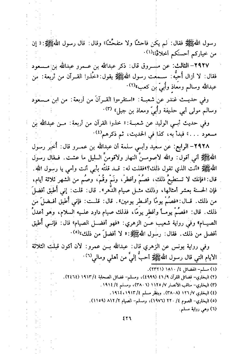 2927 - الثَّالِث: عَن مَسْرُوق قَالَ: ذكر عبد الله بن عَمْرو عبد الله بن مَسْعُود فَقَالَ: لَا أَزَال أحبه: سَمِعت رَسُول الله صلى الله عَلَيْهِ وَسلم يَقُول: " خُذُوا الْقُرْآن من أَرْبَعَة: من عبد الله وَسَالم ومعاذٍ وَأبي بن كَعْب ".