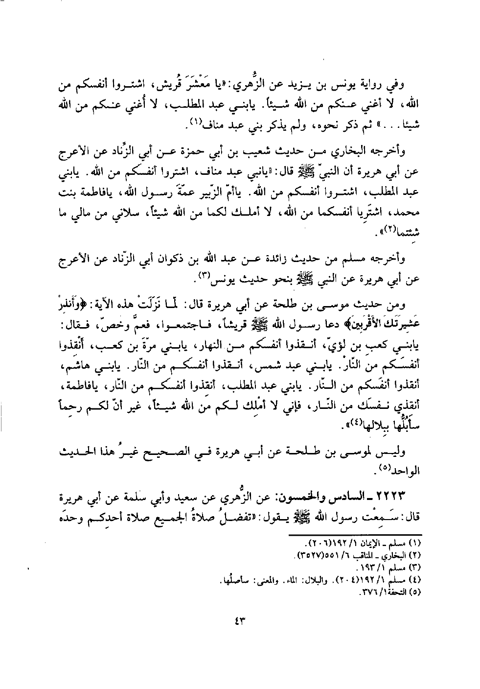 وَأخرجه البُخَارِيّ من حَدِيث شُعَيْب بن أبي حَمْزَة عَن أبي الزِّنَاد عَن الْأَعْرَج عَن أبي هُرَيْرَة أَن النَّبِي صلى الله عَلَيْهِ وَسلم قَالَ: " يَا نَبِي عبد منَاف، اشْتَروا أَنفسكُم من الله. يَا بني عبد الْمطلب، اشْتَروا أَنفسكُم من الله. يَا أم الزبير عمَّة رَسُول الله، يَا فَاطِمَة بنت مُحَمَّد، اشتريا أنفسكما من الله، لَا أملك لَكمَا من الله شَيْئا، سلاني من مَالِي مَا شئتما ".