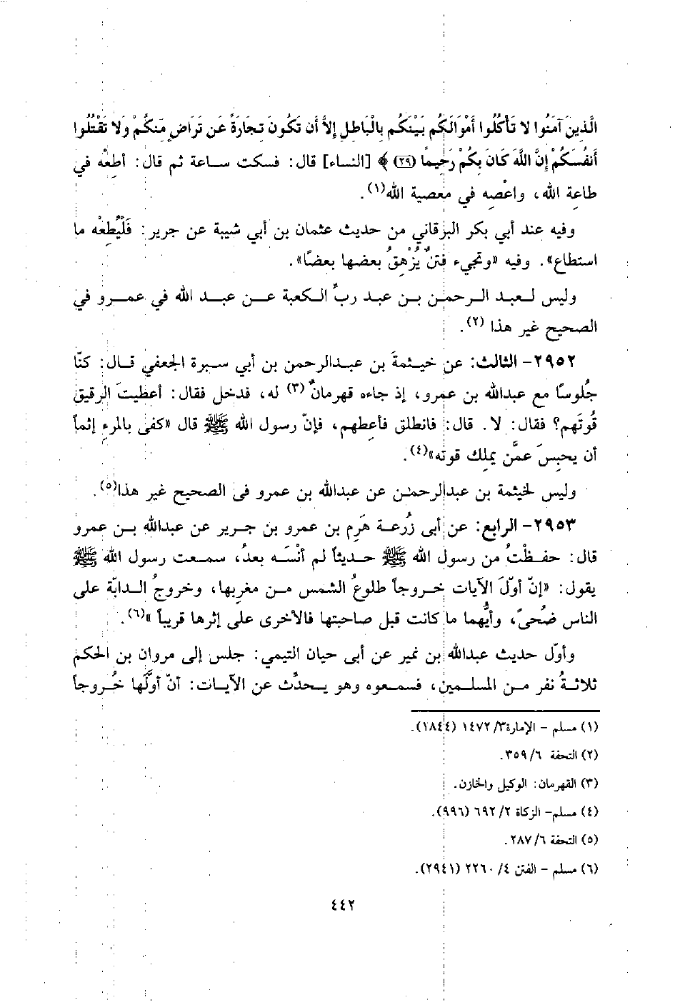2952 - الثَّالِث: عَن خَيْثَمَة بن عبد الرَّحْمَن بن أبي سُبْرَة الْجعْفِيّ قَالَ: كُنَّا جُلُوسًا مَعَ عبد الله بن عَمْرو، إِذْ جَاءَهُ قهرمانٌ لَهُ، فَدخل فَقَالَ: أَعْطَيْت الرَّقِيق قوتهم؟ فَقَالَ: لَا. قَالَ: فَانْطَلق فأعطهم، فَإِن رَسُول الله صلى الله عَلَيْهِ وَسلم قَالَ " كفى بِالْمَرْءِ إِثْمًا أَن يحبس عَمَّن يملك قوته ".