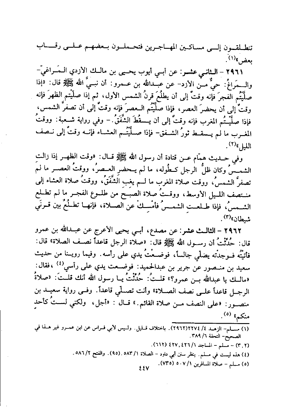 2961 - الثَّانِي عشر: عَن أبي أَيُّوب يحيى بن مَالك الْأَزْدِيّ المراغي - والمراغ: حيٌّ من الأزد - عَن عبد الله بن عَمْرو: أَن نَبِي الله صلى الله عَلَيْهِ وَسلم قَالَ: " إِذا صليتم الْفجْر فَإِنَّهُ وقتٌ إِلَى أَن يطلع قرن الشَّمْس الأول، ثمَّ إِذا صليتم الظّهْر فَإِنَّهُ وقتٌ إِلَى أَن يحضر الْعَصْر، فَإِذا صليتم الْعَصْر فَإِنَّهُ وقتٌ إِلَى أَن تصفر الشَّمْس، فَإِذا صليتم الْمغرب فَإِنَّهُ وقتٌ إِلَى أَن يسْقط الشَّفق - وَفِي رِوَايَة شُعْبَة: وَوقت الْمغرب مَا لم يسْقط ثَوْر الشَّفق - فَإِذا صليتم الْعشَاء فَإِنَّهُ وقتٌ إِلَى نصف اللَّيْل ".