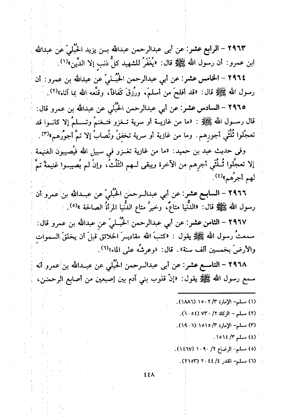 2963 - الرَّابِع عشر: عَن أبي عبد الرَّحْمَن عبد الله بن يزِيد الحبلي عَن عبد الله ابْن عَمْرو: أَن رَسُول الله صلى الله عَلَيْهِ وَسلم قَالَ: " يغْفر للشهيد كل ذنبٍ إِلَّا الدّين ".