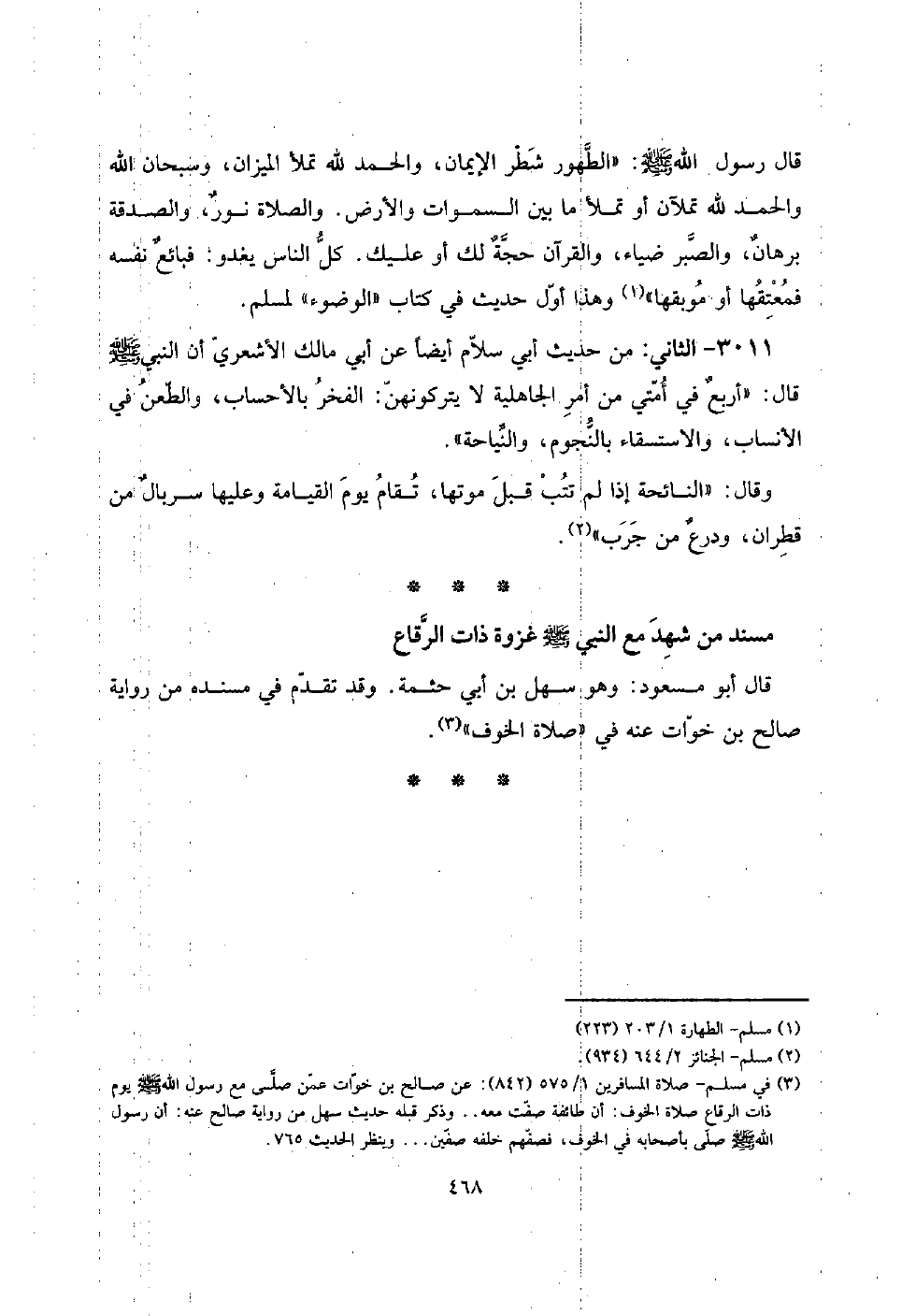 قَالَ رَسُول الله صلى الله عَلَيْهِ وَسلم: " الطّهُور شطر الْإِيمَان، وَالْحَمْد لله تملأ الْمِيزَان، وَسُبْحَان الله وَالْحَمْد لله تملآن أَو تملأ مَا بَين السَّمَوَات وَالْأَرْض. وَالصَّلَاة نورٌ، وَالصَّدَََقَة برهانٌ، وَالصَّبْر ضِيَاء، وَالْقُرْآن حجةٌ لَك أَو عَلَيْك. كل النَّاس يَغْدُو: فبائعٌ نَفسه فمعتقها أَو موبقها " وَهَذَا أول حَدِيث فِي كتاب " الْوضُوء " لمُسلم.