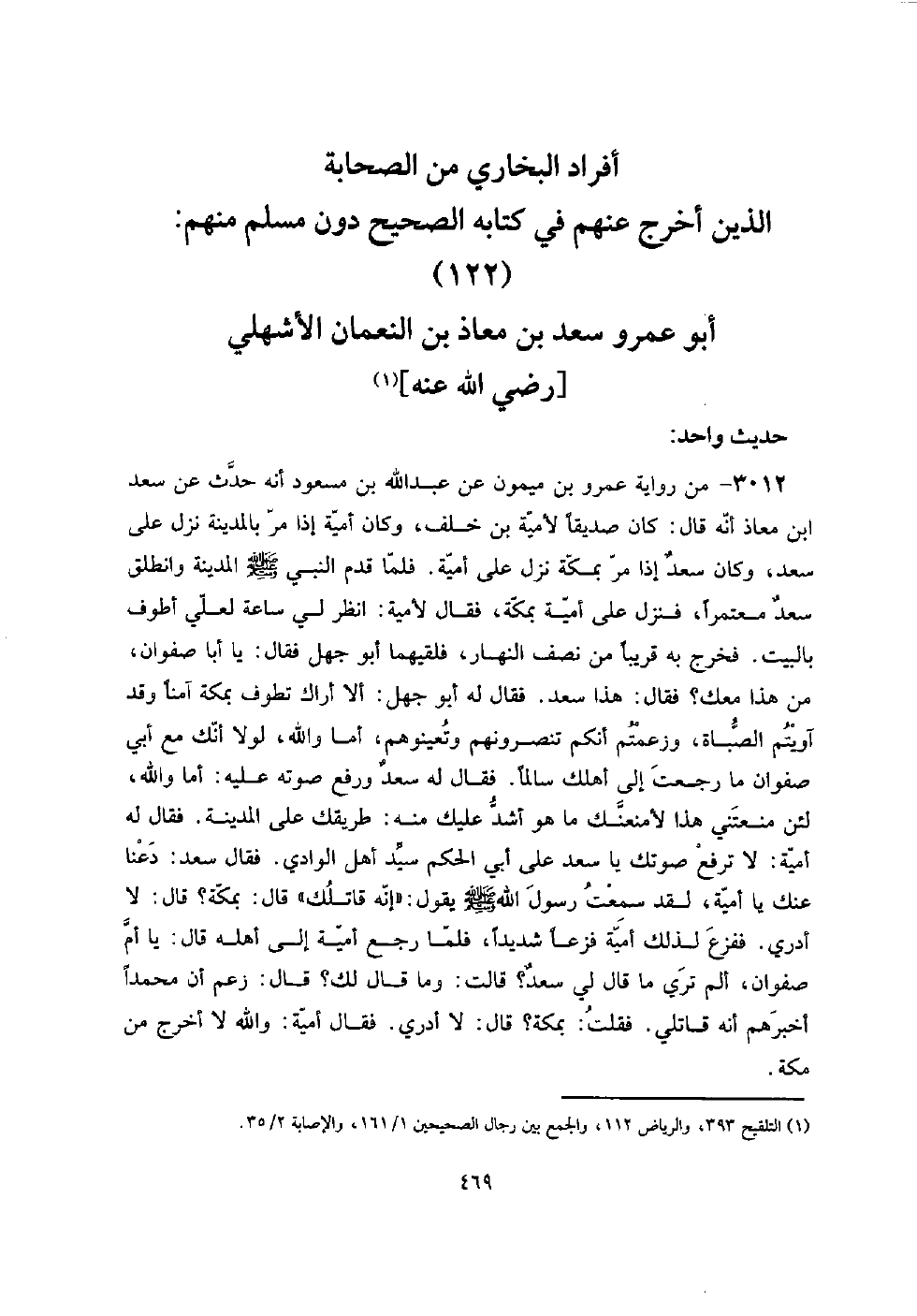 3012 - من رِوَايَة عَمْرو بن مَيْمُون عَن عبد الله بن مَسْعُود أَنه حدث عَن سعد ابْن معَاذ أَنه قَالَ: كَانَ صديقا لأمية بن خلف، وَكَانَ أُميَّة إِذا مر بِالْمَدِينَةِ نزل على سعد، وَكَانَ سعدٌ إِذا مر بِمَكَّة نزل على أُميَّة. فَلَمَّا قدم النَّبِي صلى الله عَلَيْهِ وَسلم الْمَدِينَة وَانْطَلق سعدٌ مُعْتَمِرًا، فَنزل على أُميَّة بِمَكَّة، فَقَالَ لأمية: انْظُر لي سَاعَة لعَلي أَطُوف بِالْبَيْتِ. فَخرج بِهِ قَرِيبا من نصف النَّهَار، فلقيهما أَبُو جهل فَقَالَ: يَا أَبَا صَفْوَان، من هَذَا مَعَك؟ فَقَالَ: هَذَا سعد. فَقَالَ لَهُ أَبُو جهل: أَلا أَرَاك تَطوف بِمَكَّة آمنا وَقد آويتم الصباة، وزعمتم أَنكُمْ تنصرونهم وتعينوهم، أما وَالله، لَوْلَا أَنَّك مَعَ أبي صَفْوَان مَا رجعت إِلَى أهلك سالما. فَقَالَ لَهُ سعدٌ وَرفع صَوته عَلَيْهِ: أما وَالله، لَئِن منعتني هَذَا لأمنعنك مَا هُوَ أَشد عَلَيْك مِنْهُ: طريقك على الْمَدِينَة. فَقَالَ لَهُ أُميَّة: لَا ترفع صَوْتك يَا سعد على أبي الحكم سيد أهل الْوَادي. فَقَالَ سعد: دَعْنَا عَنْك يَا أُميَّة، لقد سَمِعت رَسُول الله صلى الله عَلَيْهِ وَسلم يَقُول: " إِنَّه قَاتلك " قَالَ: بِمَكَّة؟ قَالَ: لَا أَدْرِي. فَفَزعَ لذَلِك أُميَّة فَزعًا شَدِيدا، فَلَمَّا رَجَعَ أُميَّة إِلَى أَهله قَالَ: يَا أم صَفْوَان، ألم تري مَا قَالَ لي سعدٌ؟ قَالَت: وَمَا قَالَ لَك؟ قَالَ: زعم أَن مُحَمَّدًا أخْبرهُم أَنه قاتلي. فَقلت: بِمَكَّة؟ قَالَ: لَا أَدْرِي. فَقَالَ أُميَّة: وَالله لَا أخرج من مَكَّة.