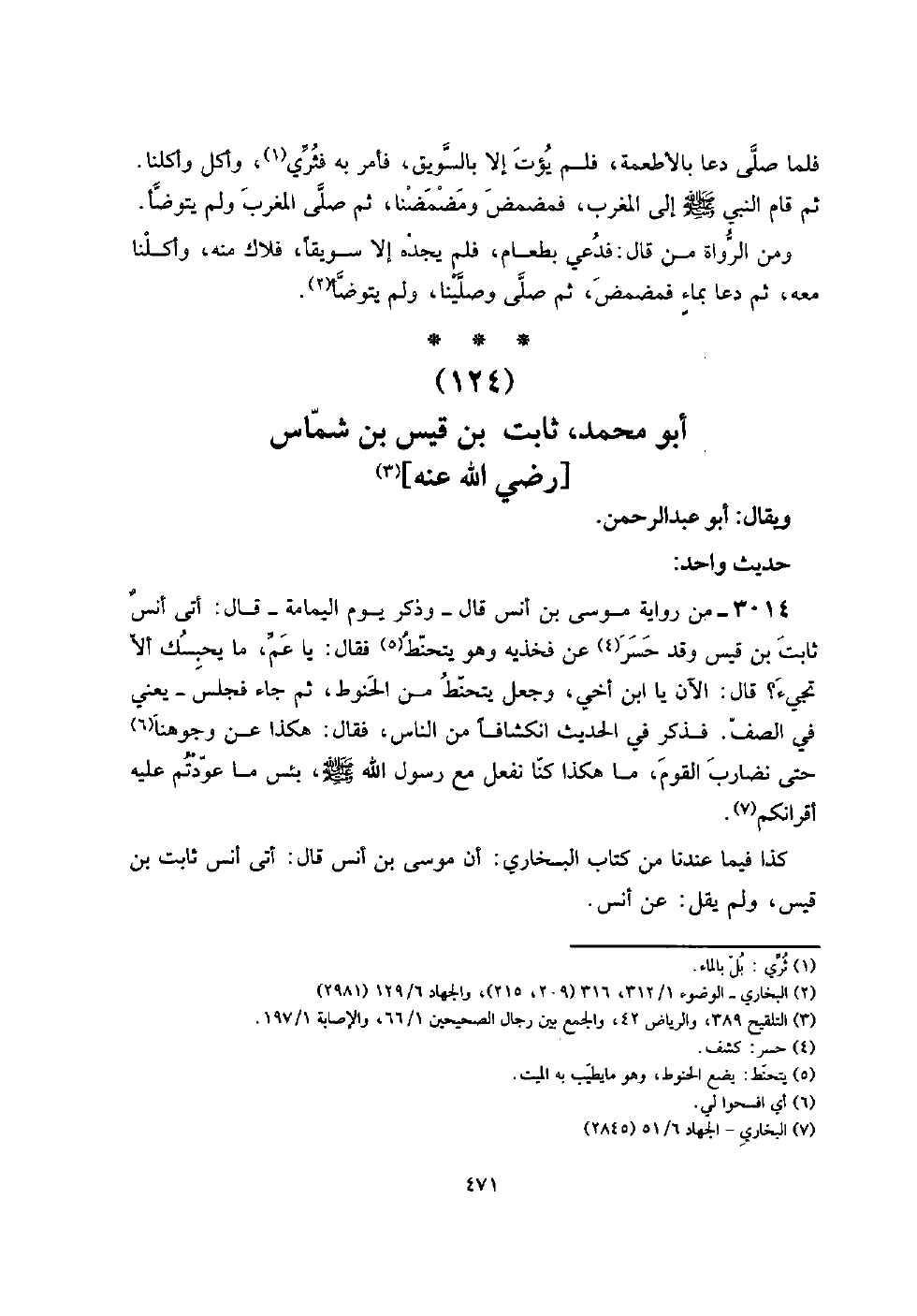 3014 - من رِوَايَة مُوسَى بن أنس قَالَ - وَذكر يَوْم الْيَمَامَة - قَالَ: أَتَى أنسٌ ثَابت بن قيس وَقد حسر عَن فَخذيهِ وَهُوَ يتحنط فَقَالَ: يَا عَم، مَا يحبسك أَلا تَجِيء؟ قَالَ: الْآن يَا ابْن أخي، وَجعل يتحنط من الحنوط، ثمَّ جَاءَ فَجَلَسَ - يَعْنِي فِي الصَّفّ. فَذكر فِي الحَدِيث انكشافاً من النَّاس، فَقَالَ: هَكَذَا عَن وُجُوهنَا حَتَّى نضارب الْقَوْم، مَا هَكَذَا كُنَّا نَفْعل مَعَ رَسُول الله صلى الله عَلَيْهِ وَسلم، بئس مَا عودتم عَلَيْهِ أَقْرَانكُم.