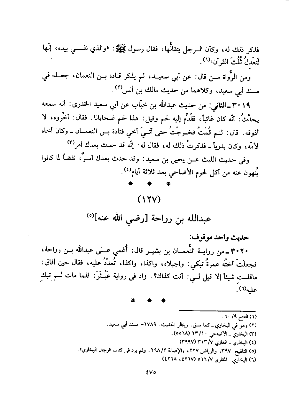 3020 - من رِوَايَة النُّعْمَان بن بشير قَالَ: أُغمي على عبد الله بن رَوَاحَة، فَجعلت أُخْته عمْرَة تبْكي: واجبلاه، واكذا، واكذا، تعدد عَلَيْهِ، فَقَالَ حِين أَفَاق: مَا قلت شَيْئا إِلَّا قيل لي: أَنْت كَذَاك؟ . زَاد فِي رِوَايَة عَبْثَر: فَلَمَّا مَاتَ لم تبك عَلَيْهِ.
