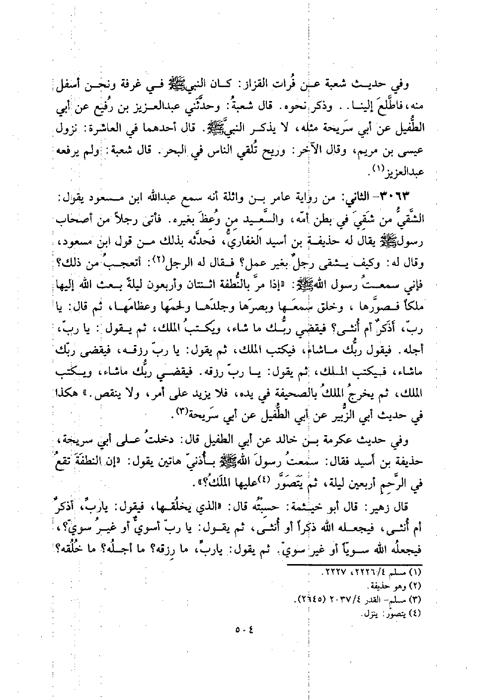 3063 - الثَّانِي: من رِوَايَة عَامر بن وَاثِلَة أَنه سمع عبد الله ابْن مَسْعُود يَقُول: الشقي من شقي فِي بطن أمه، والسعيد من وعظ بِغَيْرِهِ. فَأتى رجلا من أَصْحَاب رَسُول الله صلى الله عَلَيْهِ وَسلم يُقَال لَهُ حُذَيْفَة بن أسيد الْغِفَارِيّ، فحدثه بذلك من قَول ابْن مَسْعُود، وَقَالَ لَهُ: وَكَيف يشقى رجلٌ بِغَيْر عمل؟ فَقَالَ لَهُ الرجل: أتعجب من ذَلِك؟ فَإِنِّي سَمِعت رَسُول الله صلى الله عَلَيْهِ وَسلم: " إِذا مر بالنطفة اثْنَتَانِ وَأَرْبَعُونَ لَيْلَة بعث الله إِلَيْهَا ملكا فصورها، وَخلق سَمعهَا وبصرها وجلدها ولحمها وعظامها، ثمَّ قَالَ: يَا رب، أذكرٌ أم أُنْثَى؟ فَيَقْضِي رَبك مَا شَاءَ، وَيكْتب الْملك، ثمَّ يَقُول: يَا رب، أَجله. فَيَقُول رَبك مَا شَاءَ، فَيكْتب الْملك، ثمَّ يَقُول: يَا رب رزقه، فَيقْضى رَبك مَا شَاءَ، فَيكْتب الْملك، ثمَّ يَقُول: يَا رب رزقه. فَيقْضى رَبك مَا شَاءَ، وَيكْتب الْملك، ثمَّ يخرج الْملك بالصحيفة فِي يَده، فَلَا يزِيد على أَمر، وَلَا ينقص. " هَكَذَا فِي حَدِيث أبي الزبير عَن أبي الطُّفَيْل عَن أبي سريحَة.