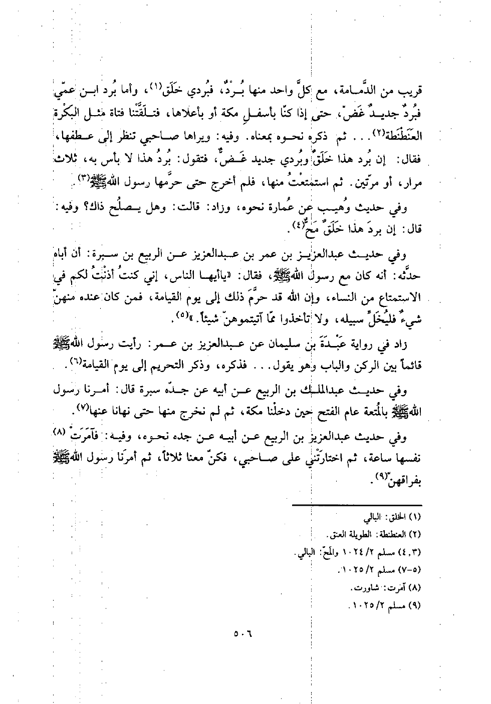 قريب من الدمامة، مَعَ كل وَاحِد مِنْهَا بردٌ، فبردي خلق، وَأما برد ابْن عمي فبردٌ جديدٌ غض، حَتَّى إِذا كُنَّا بِأَسْفَل مَكَّة أَو بِأَعْلَاهَا، فتلقتنا فتاة مثل البكرة العنطنطة ... ثمَّ ذكره نَحوه بِمَعْنَاهُ. وَفِيه: ويراها صَاحِبي تنظر إِلَى عطفها، فَقَالَ: عَن برد هَذَا خلقٌ وبردي جَدِيد غضٌّ، فَتَقول: برد هَذَا لَا بَأْس بِهِ، ثَلَاث مرار، أَو مرَّتَيْنِ. ثمَّ استمتعت مِنْهَا، فَلم أخرج حَتَّى حرمهَا رَسُول الله صلى الله عَلَيْهِ وَسلم.