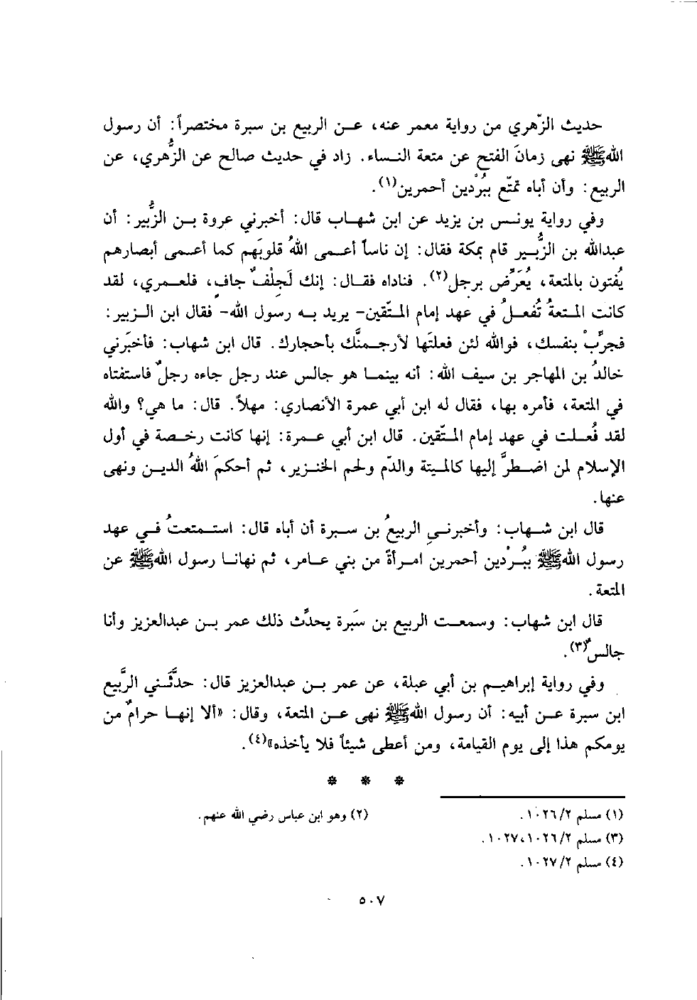 إِن نَاسا أعمى الله قُلُوبهم كَمَا أعمى أَبْصَارهم يفتون بِالْمُتْعَةِ، يعرض بِرَجُل. فناداه فَقَالَ: إِنَّك لجلفٌ جافٍ، فلعمري، لقد كَانَت الْمُتْعَة تفعل فِي عهد إِمَام الْمُتَّقِينَ - يُرِيد بِهِ رَسُول الله - فَقَالَ ابْن الزبير: فجرب بِنَفْسِك، فوَاللَّه لَئِن فعلتها لأرجمنك بأحجارك. قَالَ ابْن شهَاب: فَأَخْبرنِي خَالِد بن المُهَاجر بن سيف الله: أَنه بَيْنَمَا هُوَ جَالس عِنْد رجل جَاءَهُ رجلٌ فاستفتاه فِي الْمُتْعَة، فَأمره بهَا، فَقَالَ لَهُ ابْن أبي عمْرَة الْأنْصَارِيّ: مهلا. قَالَ: مَا هِيَ؟ وَالله لقد فعلت فِي عهد إِمَام الْمُتَّقِينَ. قَالَ ابْن أبي عمْرَة: إِنَّهَا كَانَت رخصَة فِي أول الْإِسْلَام لمن اضْطر إِلَيْهَا كالميتة وَالدَّم وَلحم الْخِنْزِير، ثمَّ أحكم الله الدّين وَنهى عَنْهَا.