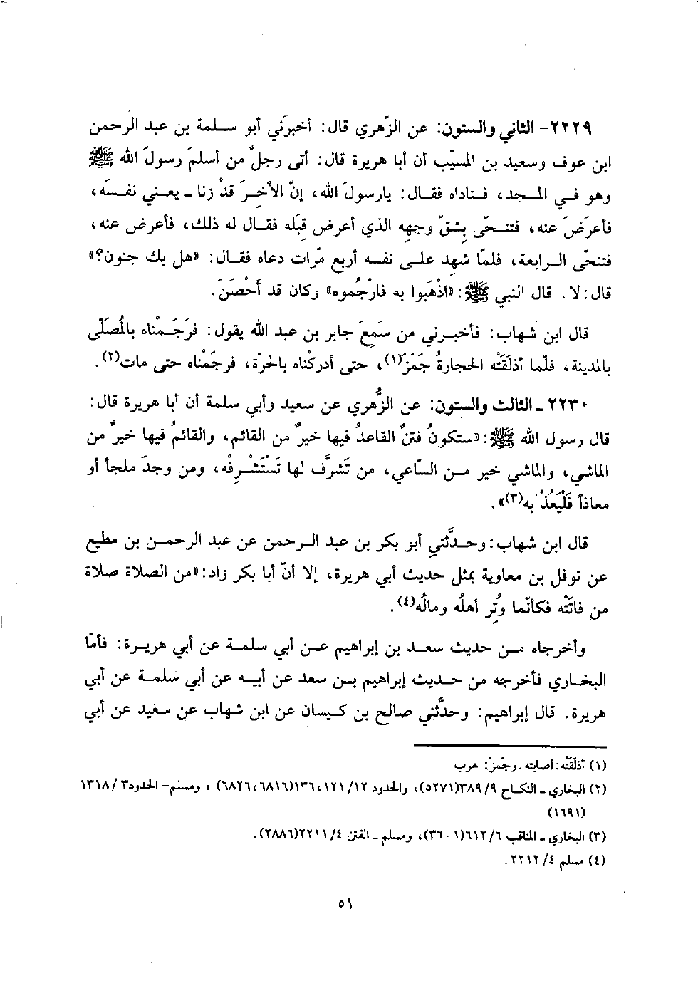 2229 - الثَّانِي وَالسِّتُّونَ: عَن الزُّهْرِيّ قَالَ: أَخْبرنِي أَبُو سَلمَة بن عبد الرَّحْمَن ابْن عَوْف وَسَعِيد بن الْمسيب أَن أَبَا هُرَيْرَة قَالَ: أَتَى رجلٌ من أسلم رَسُول الله صلى الله عَلَيْهِ وَسلم وَهُوَ فِي الْمَسْجِد، فناداه فَقَالَ: يَا رَسُول الله، إِن الْأُخَر قد زنا - يَعْنِي نَفسه، فَأَعْرض عَنهُ، فَتنحّى بشق وَجهه الَّذِي أعرض قبله فَقَالَ لَهُ ذَلِك، فَأَعْرض عَنهُ، فَتنحّى الرَّابِعَة، فَلَمَّا شهد على نَفسه أَربع مَرَّات دَعَاهُ فَقَالَ: " هَل بك جُنُون؟ " قَالَ: لَا. قَالَ النَّبِي صلى الله عَلَيْهِ وَسلم: " اذْهَبُوا بِهِ فارجموه " وَكَانَ قد أحصن.