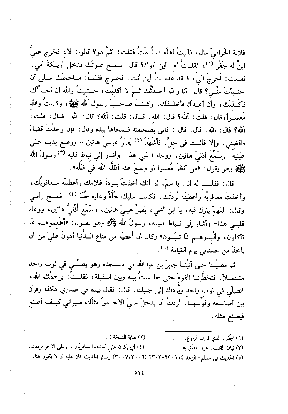 قَالَ: فَقلت لَهُ أَنا: يَا عَم، لَو أَنَّك أخذت بردة غلامك وأعطيته معافريك، وَأخذت معافريه وأعطيته بردتك، فَكَانَت عَلَيْك حلةٌ وَعَلِيهِ حلَّة. فَمسح رَأْسِي وَقَالَ: اللَّهُمَّ بَارك فِيهِ، يَا ابْن أخي، بصر عَيْني هَاتين، وَسمع أُذُنِي هَاتين، ووعاه قلبِي هَذَا - وَأَشَارَ إِلَى نِيَاط قلبه، رَسُول الله صلى الله عَلَيْهِ وَسلم وَهُوَ يَقُول: " أطعموهم مِمَّا تَأْكُلُونَ، وألبسوهم مِمَّا تلبسُونَ " وَكَانَ أَن أعْطِيه من مَتَاع الدُّنْيَا أَهْون عَليّ من أَن يَأْخُذ من حسناتي يَوْم الْقِيَامَة.