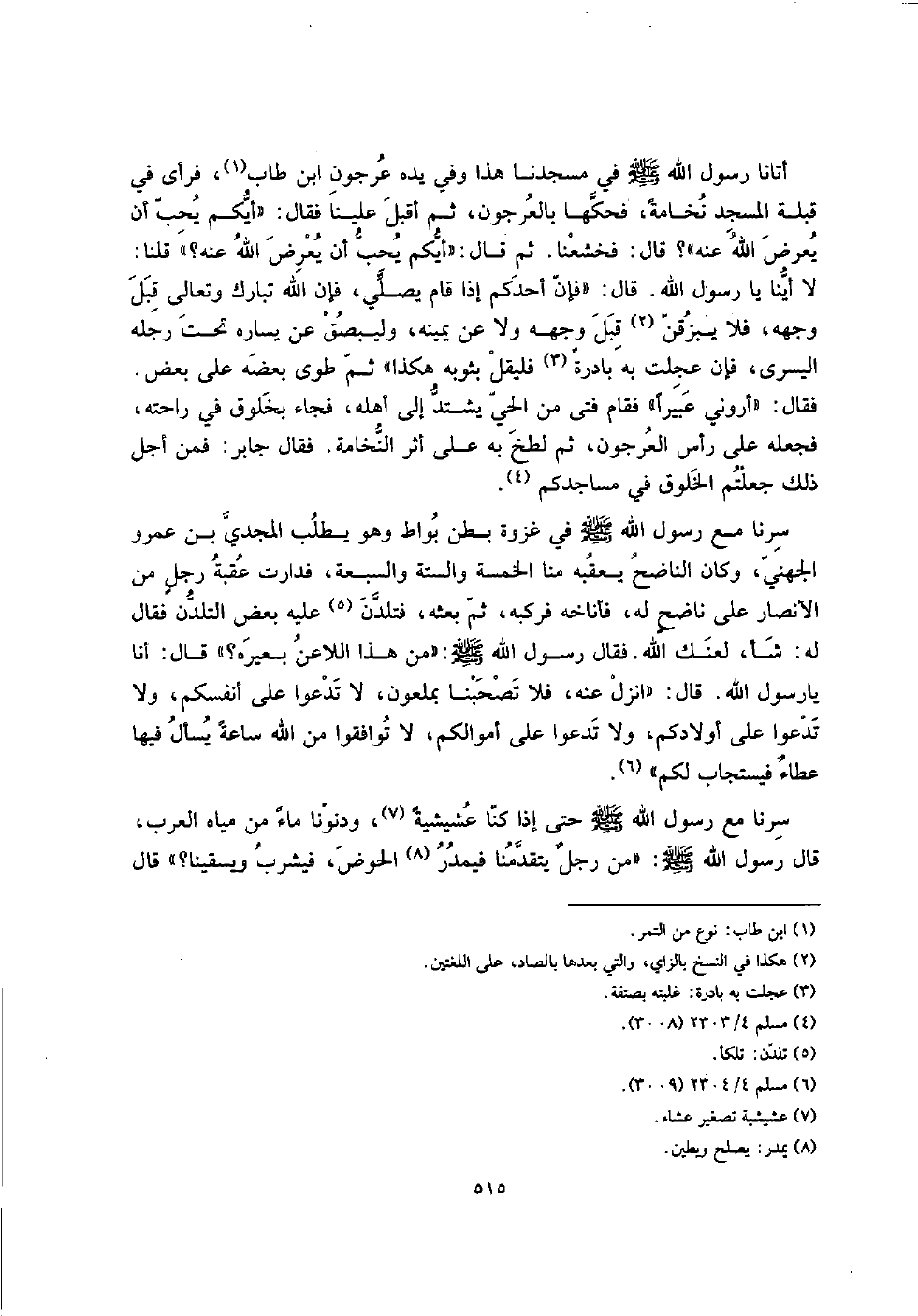سرنا مَعَ رَسُول الله صلى الله عَلَيْهِ وَسلم فِي غَزْوَة بطن بواط وَهُوَ يطْلب المجدي بن عَمْرو الْجُهَنِيّ، وَكَانَ الناضح يعقبه منا الْخَمْسَة والستة والسبعة، فدارت عقبَة رجلٍ من الْأَنْصَار على ناضحٍ لَهُ، فأناخه فَرَكبهُ، ثمَّ بَعثه، فتلدن عَلَيْهِ بعض التلدن فَقَالَ لَهُ: