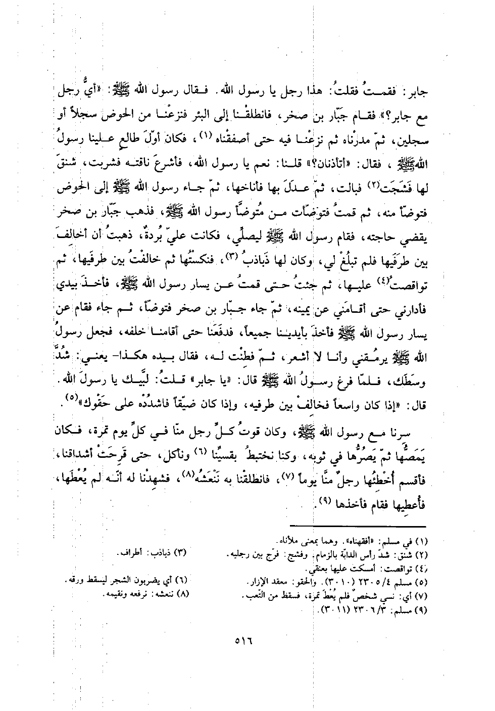 هَذَا رجل يَا رَسُول الله. فَقَالَ رَسُول الله صلى الله عَلَيْهِ وَسلم: " أَي رجل مَعَ جَابر؟ " فَقَامَ جَبَّار بن صَخْر، فَانْطَلَقْنَا إِلَى الْبِئْر فنزعنا من الْحَوْض سجلاً أَو سَجْلَيْنِ، ثمَّ مدرناه ثمَّ نَزَعْنَا فِيهِ حَتَّى أصفقناه، فَكَانَ أول طالعٍ علينا رَسُول الله صلى الله عَلَيْهِ وَسلم، فَقَالَ: " أتأذنان؟ " قُلْنَا: نعم يَا رَسُول الله، فأشرع نَاقَته فَشَرِبت، شنق لَهَا فشجت فبالت، ثمَّ عدل بهَا فأناخها، ثمَّ جَاءَ رَسُول الله صلى الله عَلَيْهِ وَسلم إِلَى الْحَوْض فَتَوَضَّأ مِنْهُ، ثمَّ قُمْت فَتَوَضَّأت من متوضأ رَسُول الله صلى الله عَلَيْهِ وَسلم، فَذهب جَبَّار بن صَخْر يقْضِي حَاجته، فَقَامَ رَسُول الله صلى الله عَلَيْهِ وَسلم ليُصَلِّي، فَكَانَت عَليّ بردةٌ، ذهبت أَن أُخَالِف بَين طرفيها فَلم تبلغ لي، وَكَانَ لَهَا ذباذب، فنكستها ثمَّ خَالَفت بَين طرفيها، ثمَّ تواقصت عَلَيْهَا، ثمَّ جِئْت حَتَّى قُمْت عَن يسَار رَسُول الله صلى الله عَلَيْهِ وَسلم، فَأخذ بيَدي فأدارني حَتَّى أقامني عَن يَمِينه، ثمَّ جَاءَ جَبَّار بن صَخْر فَتَوَضَّأ، ثمَّ جَاءَ فَقَامَ عَن يسَار رَسُول الله صلى الله عَلَيْهِ وَسلم فَأخذ بِأَيْدِينَا جَمِيعًا، فدفعنا حَتَّى أقامنا خَلفه، فَجعل رَسُول الله صلى الله عَلَيْهِ وَسلم يرمقني وَأَنا لَا أشعر، ثمَّ فطنت لَهُ، فَقَالَ بِيَدِهِ هَكَذَا - يَعْنِي: شدّ وسطك، فَلَمَّا فرغ رَسُول الله صلى الله عَلَيْهِ وَسلم قَالَ: " يَا جَابر " قلت: لبيْك يَا رَسُول الله. قَالَ: " إِذا كَانَ وَاسِعًا فَخَالف بَين طَرفَيْهِ، وَإِذا كَانَ ضيقا فاشدده على حقوك ".