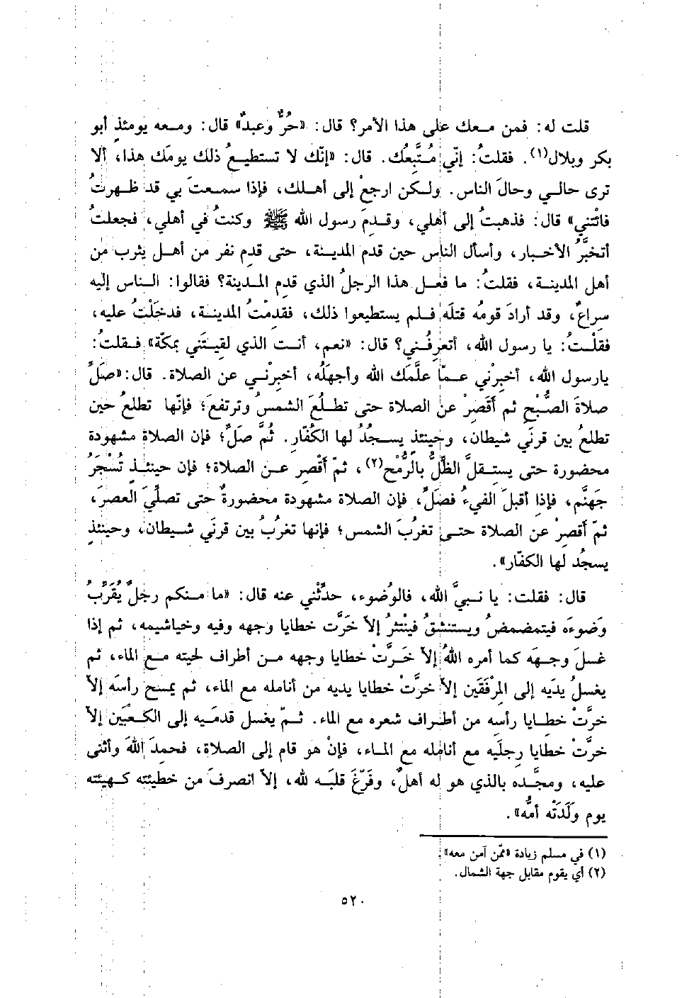 قلت لَهُ: فَمن مَعَك على هَذَا الْأَمر؟ قَالَ: " حرٌّ وعبدٌ " قَالَ: وَمَعَهُ يومئذٍ أَبُو بكر وبلال. فَقلت: إِنِّي متبعك. قَالَ: " إِنَّك لَا تَسْتَطِيع ذَلِك يَوْمك هَذَا، أَلا ترى حَالي وَحَال النَّاس. وَلَكِن ارْجع إِلَى أهلك، فَإِذا سَمِعت بِي قد ظَهرت فائتني " قَالَ: فَذَهَبت إِلَى أَهلِي، وَقدم رَسُول الله صلى الله عَلَيْهِ وَسلم وَكنت فِي أَهلِي، فَجعلت أتخبر الْأَخْبَار، وأسأل النَّاس حِين قدم الْمَدِينَة، حَتَّى قدم نفر من أهل يثرب من أهل الْمَدِينَة، فَقلت: مَا فعل هَذَا الرجل الَّذِي قدم الْمَدِينَة؟ فَقَالُوا: النَّاس إِلَيْهِ سراعٌ، وَقد أَرَادَ قومه قَتله فَلم يستطيعوا ذَلِك، فَقدمت الْمَدِينَة، فَدخلت عَلَيْهِ، فَقلت: يَا رَسُول الله، أتعرفني؟ قَالَ: " نعم، أَنْت الَّذِي لقيتني بِمَكَّة " فَقلت: يَا رَسُول الله، أَخْبرنِي عَمَّا علمك الله وأجهله، أَخْبرنِي عَن الصَّلَاة. قَالَ: " صل صَلَاة الصُّبْح ثمَّ أقصر عَن الصَّلَاة حَتَّى تطلع الشَّمْس وترتفع؛ فَإِنَّهَا تطلع حِين تطلع بَين قَرْني شَيْطَان، وحينئذٍ يسْجد لَهَا الْكفَّار. ثمَّ صل؛ فَإِن الصَّلَاة مَشْهُودَة محضورة حَتَّى يسْتَقلّ الظل بِالرُّمْحِ، ثمَّ أقصر عَن الصَّلَاة؛ فَإِن حينئذٍ تسجر جَهَنَّم، فَإِذا أقبل الْفَيْء فصل، فَإِن الصَّلَاة مَشْهُودَة محضورةٌ حَتَّى تصلي الْعَصْر، ثمَّ أقصر عَن الصَّلَاة حَتَّى تغرب الشَّمْس؛ فَإِنَّهَا تغرب بَين قَرْني شَيْطَان، وحينئذٍ يسْجد لَهَا الْكفَّار ".