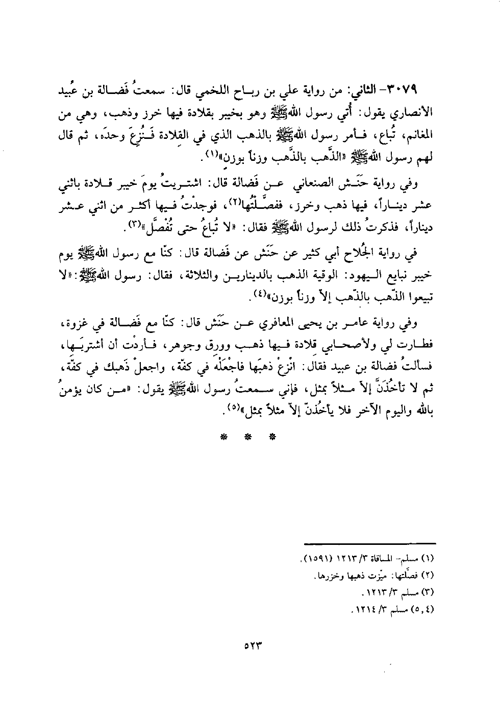 3079 - الثَّانِي: من رِوَايَة عَليّ بن رَبَاح اللَّخْمِيّ قَالَ: سَمِعت فضَالة بن عبيد الْأنْصَارِيّ يَقُول: أُتِي رَسُول الله صلى الله عَلَيْهِ وَسلم وَهُوَ بِخَيْبَر بقلادة فِيهَا خرز وَذهب، وَهِي من الْمَغَانِم، تبَاع، فَأمر رَسُول الله صلى الله عَلَيْهِ وَسلم بِالذَّهَب الَّذِي فِي القلادة فَنزع وَحده، ثمَّ قَالَ لَهُم رَسُول الله صلى الله عَلَيْهِ وَسلم: " الذَّهَب بِالذَّهَب وزنا بوزنٍ ".
