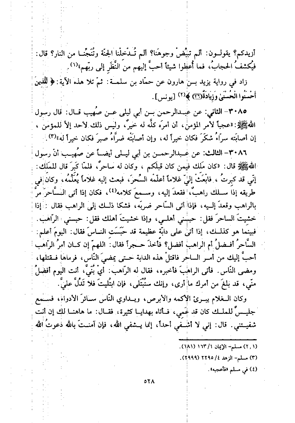 3086 - الثَّالِث: عَن عبد الرَّحْمَن بن أبي ليلى أَيْضا عَن صُهَيْب أَن رَسُول الله صلى الله عَلَيْهِ وَسلم قَالَ: " كَانَ ملك فِيمَن كَانَ قبلكُمْ، وَكَانَ لَهُ ساحرٌ، فَلَمَّا كبر قَالَ للْملك: إِنِّي قد كَبرت، فَابْعَثْ إِلَيّ غُلَاما أعلمهُ السحر، فَبعث إِلَيْهِ غُلَاما يُعلمهُ، وَكَانَ فِي طَرِيقه إِذا سلك راهبٌ، فَقعدَ إِلَيْهِ، وَسمع كَلَامه، فَكَانَ إِذا أَتَى السَّاحر مر بِالرَّاهِبِ وَقعد إِلَيْهِ، فَإِذا أَتَى السَّاحر ضربه، فَشَكا ذَلِك إِلَى الراهب فَقَالَ: إِذا خشيت السَّاحر فَقل: حَبَسَنِي أَهلِي، وَإِذا خشيت أهلك فَقل: حَبَسَنِي الراهب.