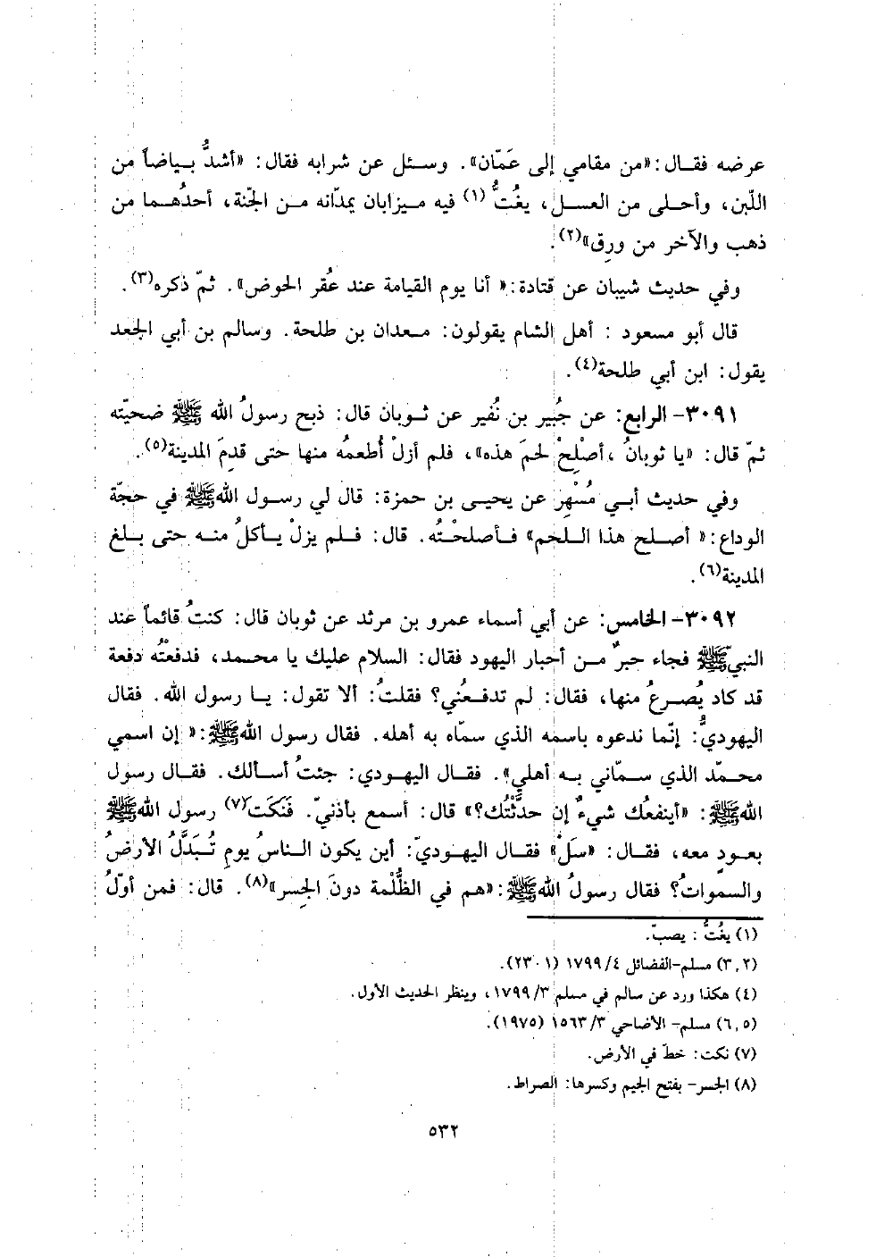 3092 - الْخَامِس: عَن أبي أَسمَاء عَمْرو بن مرْثَد عَن ثَوْبَان قَالَ: كنت قَائِما عِنْد النَّبِي صلى الله عَلَيْهِ وَسلم فجَاء حبرٌ من أَحْبَار الْيَهُود فَقَالَ: السَّلَام عَلَيْك يَا مُحَمَّد، فَدَفَعته دفْعَة قد كَاد يصرع مِنْهَا، فَقَالَ: لم تدفعني؟ فَقلت: أَلا تَقول: يَا رَسُول الله. فَقَالَ الْيَهُودِيّ: إِنَّمَا نَدْعُوهُ باسمه الَّذِي سَمَّاهُ بِهِ أَهله. فَقَالَ رَسُول الله صلى الله عَلَيْهِ وَسلم: " إِن اسْمِي مُحَمَّد الَّذِي سماني بِهِ أَهلِي ". فَقَالَ الْيَهُودِيّ: جِئْت أَسأَلك. فَقَالَ رَسُول الله صلى الله عَلَيْهِ وَسلم: " أينفعك شيئٌ إِن حدثتك؟ " قَالَ: أسمع بأذني. فَنكتَ رَسُول الله صلى الله عَلَيْهِ وَسلم بعودٍ مَعَه، فَقَالَ: " سل " فَقَالَ الْيَهُودِيّ: أَيْن يكون النَّاس يَوْم تبدل الأَرْض وَالسَّمَوَات؟ فَقَالَ رَسُول الله صلى الله عَلَيْهِ وَسلم: " هم فِي الظلمَة دون الجسر ". قَالَ: فَمن أول
