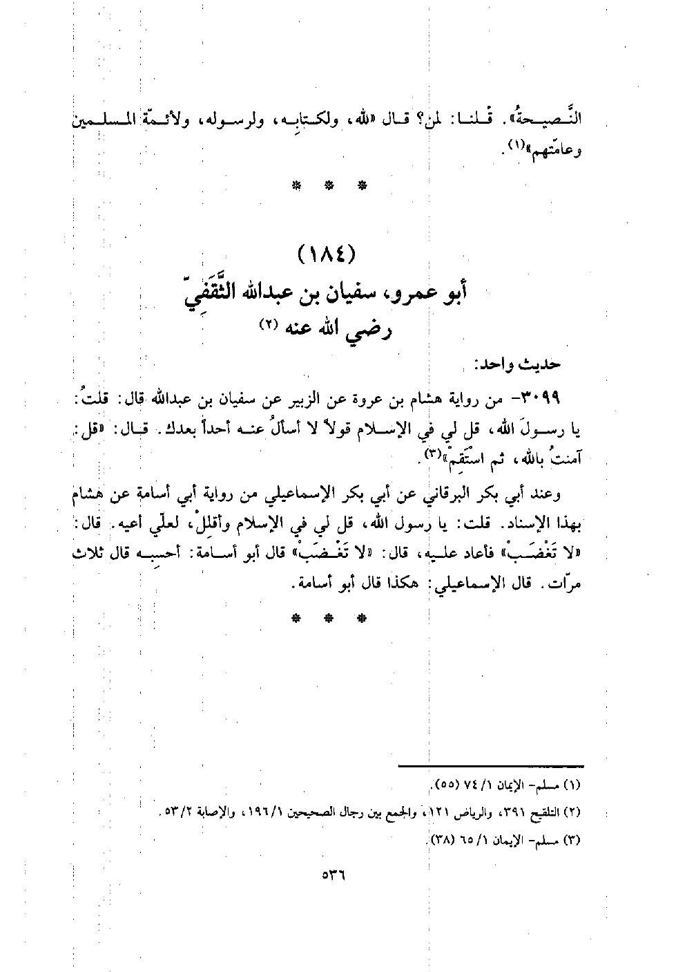 حَدِيث وَاحِد: 3099 - من رِوَايَة هِشَام بن عُرْوَة عَن الزبير عَن سُفْيَان بن عبد الله قَالَ: قلت: يَا رَسُول الله، قل لي فِي الْإِسْلَام قولا لَا أسأَل عَنهُ أحدا بعْدك. قَالَ: " قل: آمَنت بِاللَّه، ثمَّ اسْتَقِم ".