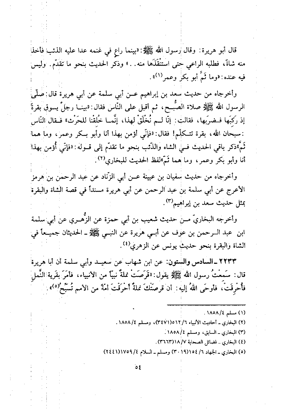 صلى الرَّسُول الله صلى الله عَلَيْهِ وَسلم صَلَاة الصُّبْح، ثمَّ أقبل على النَّاس فَقَالَ: " بَينا رجلٌ يَسُوق بقرة إِذْ ركبهَا فضربها، فَقَالَت: إِنَّا لم نخلق لهَذَا، إِنَّمَا خلقنَا للحرث " فَقَالَ النَّاس: سُبْحَانَ الله، بقرة تَتَكَلَّم! فَقَالَ: " فَإِنِّي أُؤْمِن بِهَذَا أَنا وَأَبُو بكر وَعمر، وَمَا هما ثمَّ " ذكر بَاقِي الحَدِيث فِي الشاه وَالذِّئْب بِنَحْوِ مَا تقدم إِلَى قَوْله: " فَإِنِّي أُؤْمِن بِهَذَا أَنا وَأَبُو بكر وَعمر، وَمَا هما ثمَّ " لفظ الحَدِيث للْبُخَارِيّ.