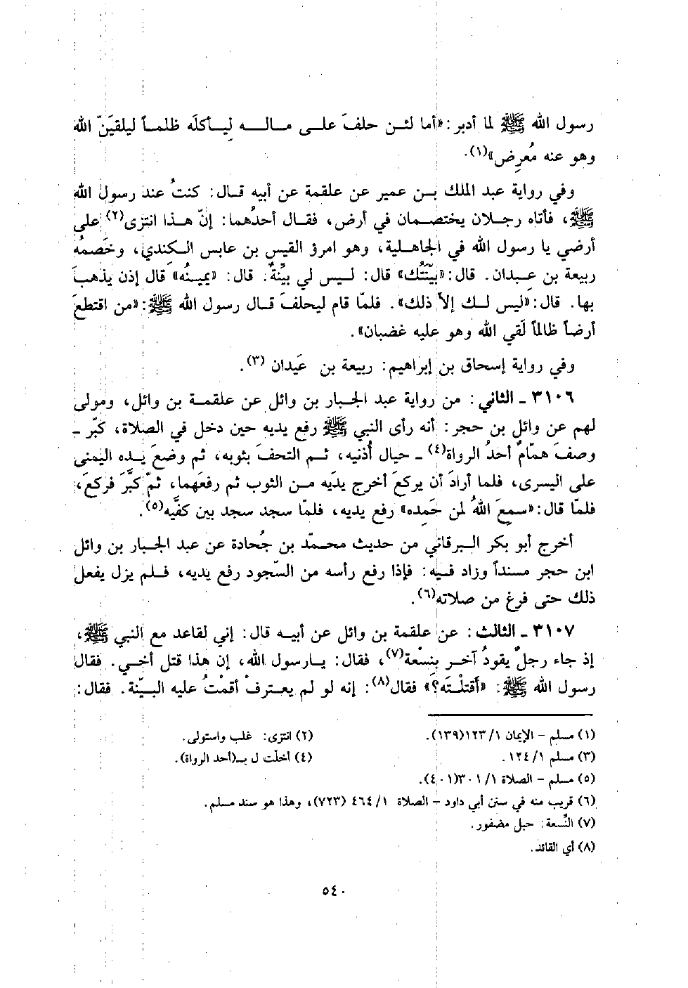 3107 - الثَّالِث: عَن عَلْقَمَة بن وَائِل عَن أَبِيه قَالَ: إِنِّي لقاعد مَعَ النَّبِي صلى الله عَلَيْهِ وَسلم، إِذْ جَاءَ رجلٌ يَقُود آخر بنسعة، فَقَالَ: يَا رَسُول الله، إِن هَذَا قتل أخي. فَقَالَ رَسُول الله صلى الله عَلَيْهِ وَسلم: " أقتلته؟ " فَقَالَ: إِنَّه لَو لم يعْتَرف أَقمت عَلَيْهِ الْبَيِّنَة. فَقَالَ: