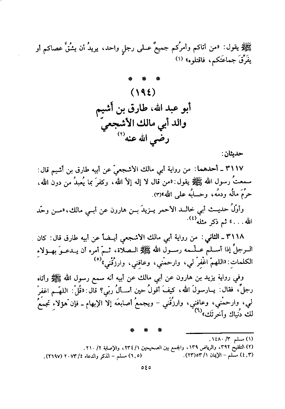 3118 - الثَّانِي: من رِوَايَة أبي مَالك الْأَشْجَعِيّ أَيْضا عَن أَبِيه طَارق قَالَ: كَانَ الرجل إِذا أسلم علمه رَسُول الله صلى الله عَلَيْهِ وَسلم الصَّلَاة، ثمَّ أمره أَن يَدْعُو بهؤلاء الْكَلِمَات: " اللَّهُمَّ اغْفِر لي، وارحمني، وَعَافنِي، وارزقني ".