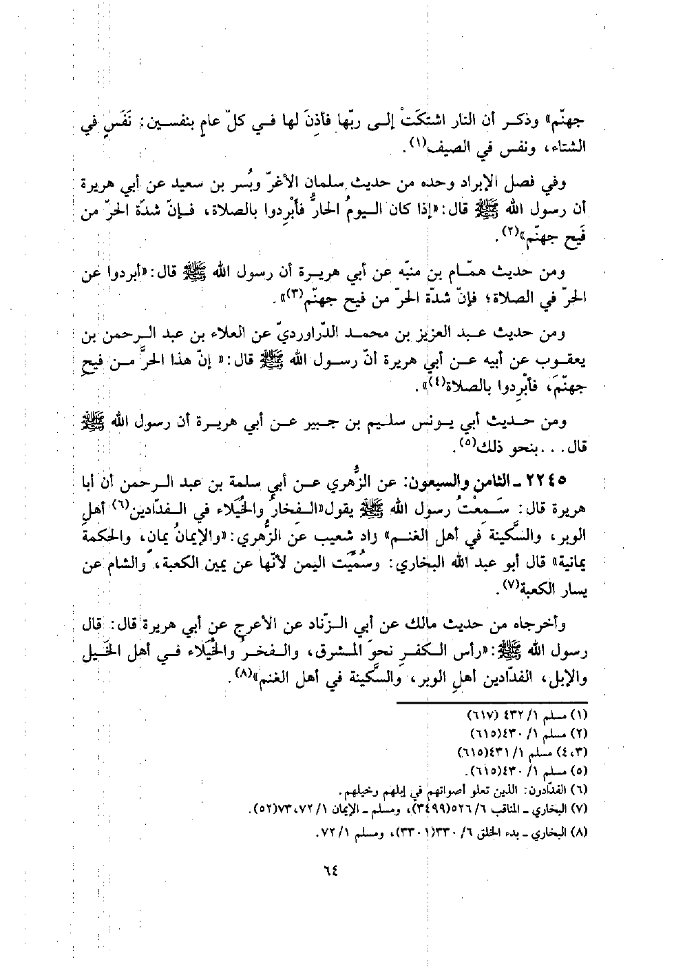 2245 - الثَّامِن وَالسَّبْعُونَ: عَن الزُّهْرِيّ عَن أبي سَلمَة بن عبد الرَّحْمَن أَن أَبَا هُرَيْرَة قَالَ: سَمِعت رَسُول الله صلى الله عَلَيْهِ وَسلم يَقُول " الفخار وَالْخُيَلَاء فِي الْفَدادِين أهل الْوَبر، والسكينة فِي أهل الْغنم " زَاد شُعَيْب عَن الزُّهْرِيّ: " وَالْإِيمَان يمانٍ، وَالْحكمَة يَمَانِية " قَالَ أَبُو عبد الله البُخَارِيّ: وَسميت الْيمن لِأَنَّهَا عَن يَمِين الْكَعْبَة، وَالشَّام عَن يسَار الْكَعْبَة.