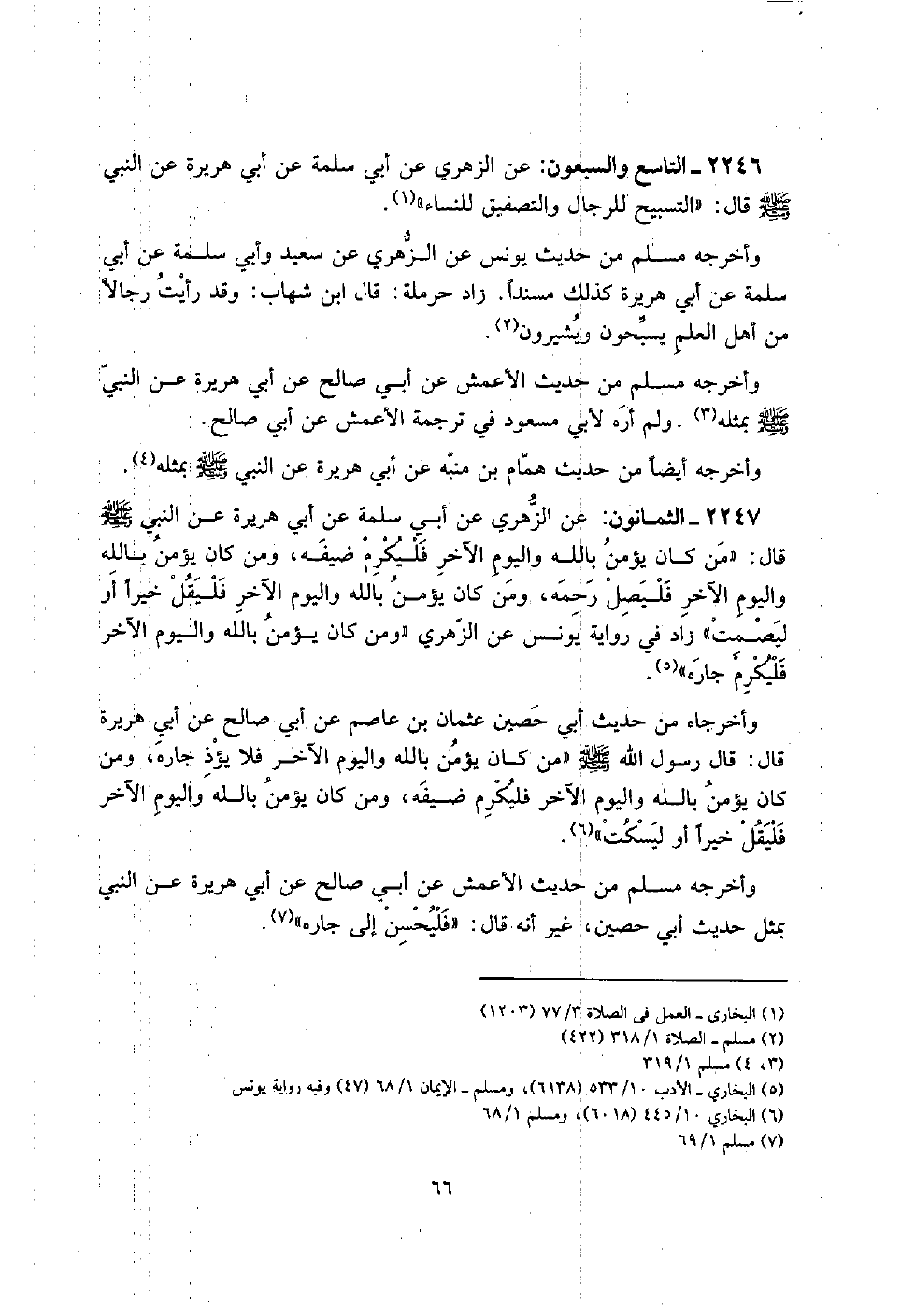 2246 - التَّاسِع وَالسَّبْعُونَ: عَن الزُّهْرِيّ عَن أبي سَلمَة عَن أبي هُرَيْرَة عَن النَّبِي صلى الله عَلَيْهِ وَسلم قَالَ: التَّسْبِيح للرِّجَال والتصفيق للنِّسَاء ".